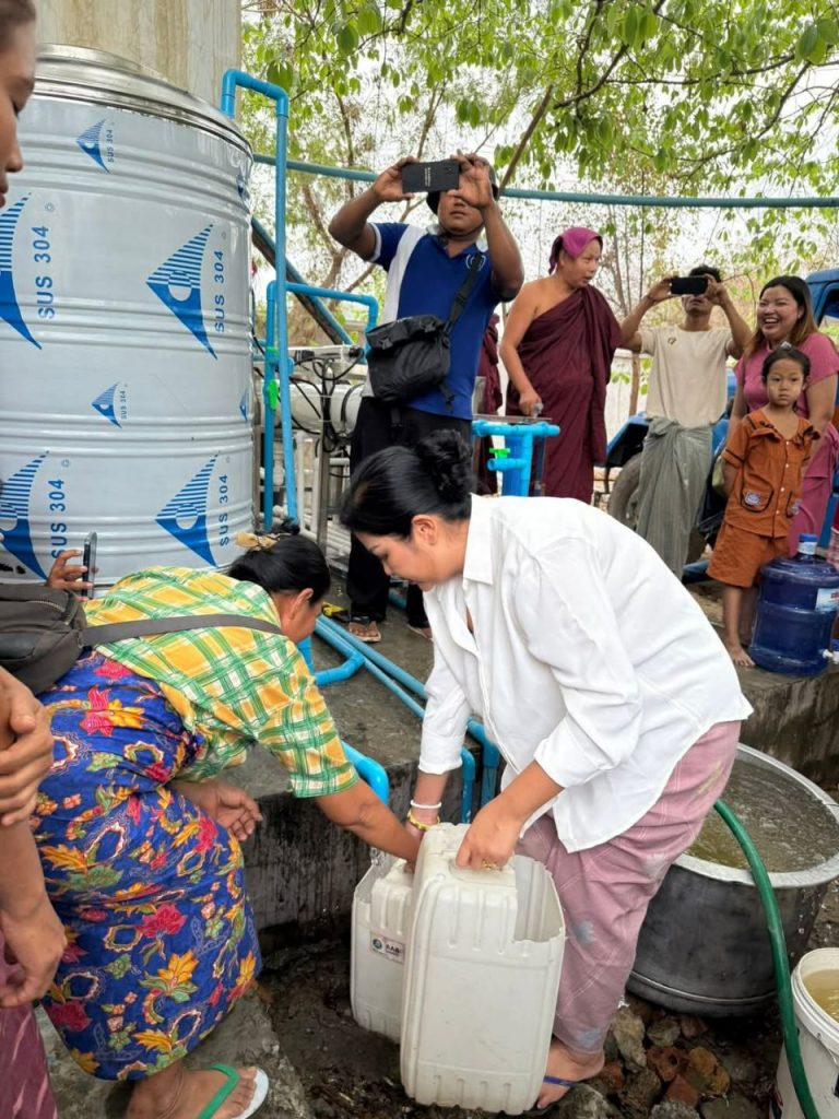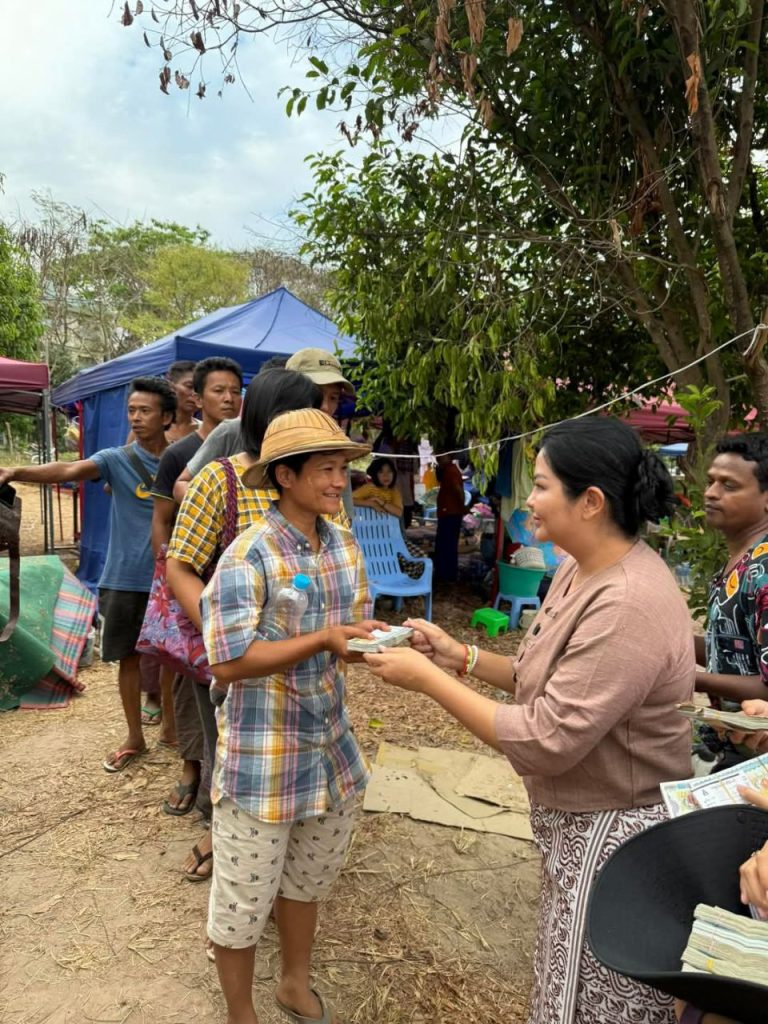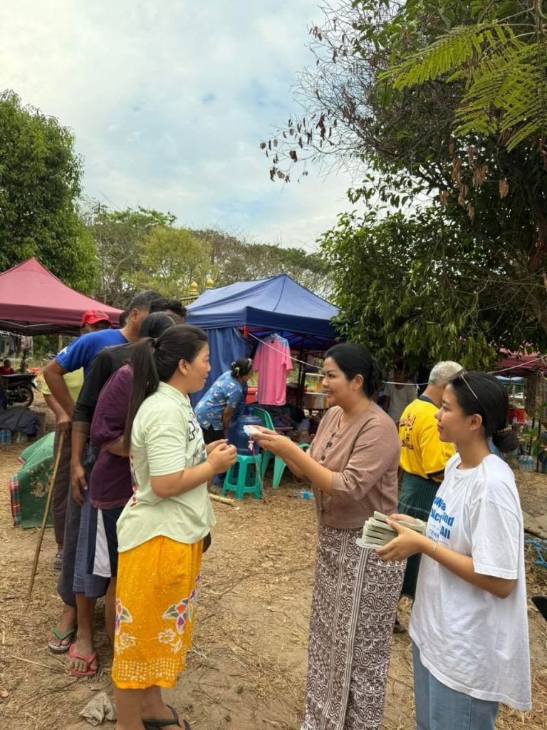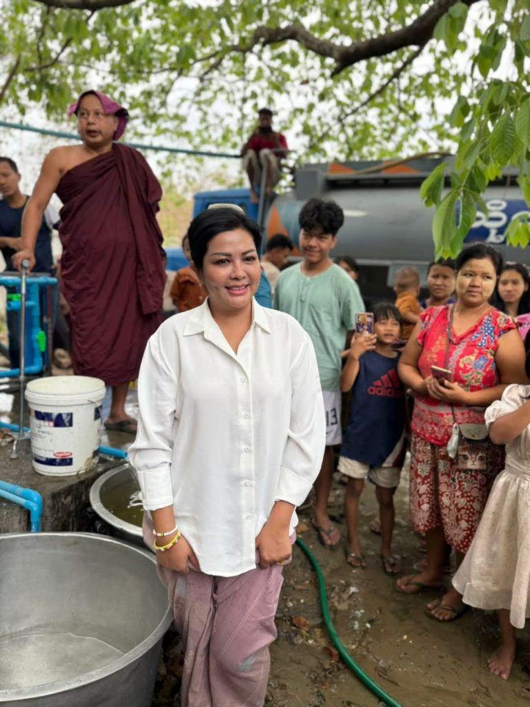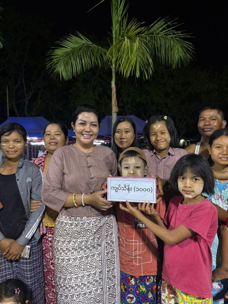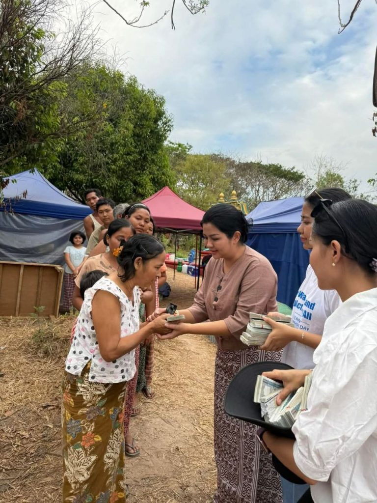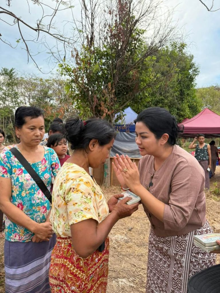“ဘာပဲဖြစ်ဖြစ် ဒီကလူတွေ မိသားစုဝင်တွေက အမကို ငွေရေးကြေးတစ်ခုတည်း မျှော်တာမဟုတ်ဘဲ မေတ္တာတရားကို မျှော်ကြတာမို့ အမ မရောက်ရောက်အောင် လာဖြစ်ခဲ့တာပါ။ မိသားစုတွေ အကုန်ဆုံးရှုံးသွားတဲ့အတွက်လည်း တကယ် စိတ်မကောင်းဘူး။ အလှူရှင်တွေက နေရာအနှံ့သွားဖို့အတွက် လှူပေးကြတယ်။ အမအနေနဲ့ကလည်း ကျန်တဲ့မိသားစုအကုန်လုံး လှူဒါန်းရတဲ့နေရာမှာ ခွဲခြမ်းစိတ်ဖြာပြီး နိုင်သလောက်လှူပေးဖြစ်ပါတယ်။ အဓိကလူတွေက စိတ်ဒဏ်ရာပေါ့နော်။ မိသားစုတစ်ခုပျက်စီးသွားတာမို့ အားငယ်တာ စိတ်ညစ်တာတွေရှိတယ်။ လူပဲလာလာ သူတို့အတွက် ခွန်အားဖြစ်စေတာပေါ့။ မတွေးနဲ့ဆိုတော့ ဒီကိစ္စပဲ ခေါင်းထဲရောက်နေတာပေါ့။ အမပေးလှူလိုက်တဲ့ ငွေကြေးတချို့နဲ့ သူတို့လေးတွေ ပြန်ပြီးရပ်တည်ဖို့ရာအတွက်ပါ။ စားစရာနဲ့ တခြားအပိုင်းတွေကို ကျန်တဲ့သူတွေက အင်တိုက်အားတိုက်လှူနေကြတော့ ငွေကြေးလှူတယ်ဆိုရင် သူတို့စိတ်တိုင်းကျ သုံးလို့ရမယ်။ အိမ်ပြင်လို့လည်းရသလို ငှါးနေလိုရအောင် ငွေကြေးလှူပေးဖြစ်တာပါ”လို့ သရုပ်ဆောင် ခိုင်နှင်းဝေက ပြောပါတယ်။