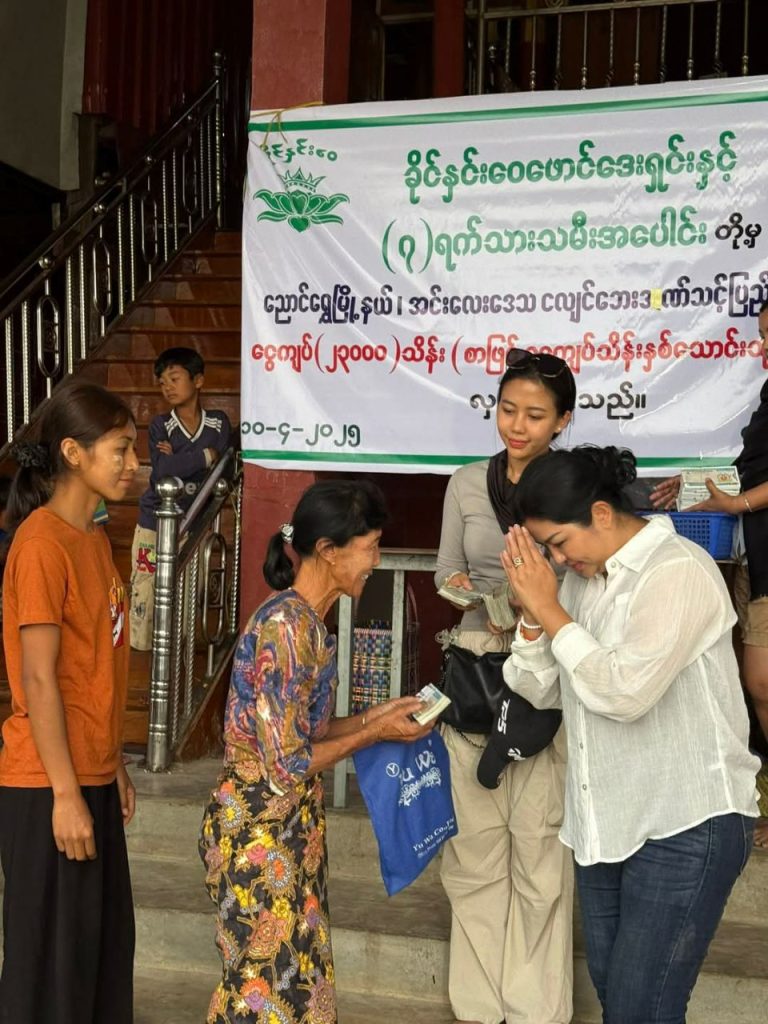 ပရဟိတမင်းသမီး ခိုင်နှင်းဝေကတော့ ညောင်ရွှေမြို့နယ်၊ အင်းလေးဒေသရှိ ငလျင်ဘေးသင့်ပြီး အလုံးစုံ ပျက်စီးသွားတဲ့ အိမ်ခြေ ၂၂၉၇ အိမ်အတွက် တစ်အိမ်ထောင်ကို ကျပ် ၁၀ သိန်းနှုန်းနဲ့ စုစုပေါင်း ကျပ်သိန်းပေါင်း ၂၃၀၀၀ ကို ထောက်ပံ့ကူညီမှုပေးရင်း အားပေးနှစ်သိမ့်စကားပြောခဲ့ပါတယ်။