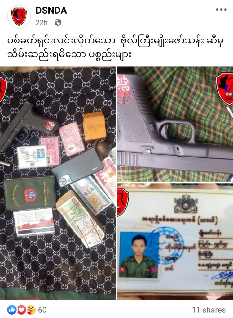 ဖြစ်စဥ်က ဧပြီလ ၁၁ ရက်နေ့မှာ ရွာငံမြို့နယ်၊ ရွာငံ-အောင်ပန်း လမ်းမဘေး လမ်းခွဲတစ်နေရာမှာ DSNDA က PDF တွေ စစ်ဆေးရေး လုပ်ဆောင်နေချိန် အိမ်စီးကား ၁ စီးက စစ်ဆေးခံမှုမရှိဘဲ ကားပြန်လှည့်ပြေးတာကြောင့် ဝိုင်းဝန်းပစ်ခတ်လိုက်ကြတာပါ။