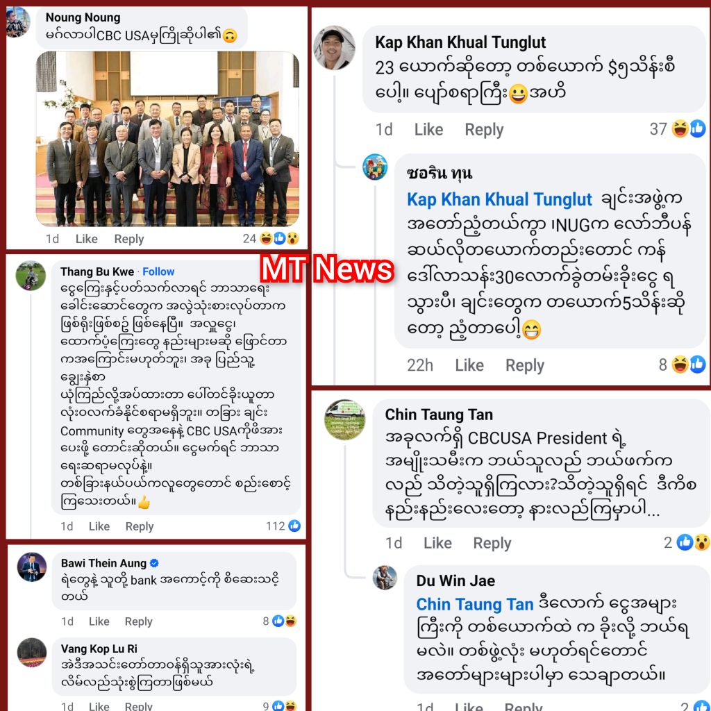 “CBCUSA အနေနဲ့ တလောတုန်းက တော်လှန်ရေးရန်ပုံငွေကိစ္စနဲ့ ပတ်သက်ပြီး တံခါးပိတ် အစည်းဝေးလုပ်ကြောင်း သိရတယ်။ ၂၀၂၁-၂၀၂၃ ကြား CBCUSA ရရှိထားတဲ့ တော်လှန်ရေးရန်ပုံငွေ စုစုပေါင်း ဒေါ်လာ ၁၂ သန်းကျော် ရရှိထားပါတယ်။ ဒါ CBCUSA ကိုယ်တိုင် ဖော်ပြခဲ့တဲ့ စာရင်းအရပါ။ ဒီရန်ပုံငွေကိစ္စနဲ့ ပတ်သက်ပြီး လွန်ခဲ့တဲ့ တစ်လလောက်က တံခါးပိတ် အစည်းဝေးလုပ်တယ်လို့ သိရပါတယ်။ တံခါးပိတ် အစည်းဝေးမှ သိရှိတဲ့အချက်လက်အရ CBCUSA က ချင်းအမျိုးသားတပ်ဦး (CNF/CNA) ထံ ကန်ဒေါ်လာ ၅၄၆,၅၈၇(ငါးသိန်းလေးသောင်းခြောက်ထောင်ငါးရာရှစ်ဆယ်ခုနစ် ဒေါ်လာ) တိတိ သာပေးထားကြောင်း ဖော်ပြထားတယ်။ ကျန်ငွေ ကန်ဒေါ်လာ ၁၁ ဒသမ ၅ သန်းကျော်ရှိပြီး အရင်က ဖော်ပြချက်အရ ကန်ဒေါ်လာ ၅ သန်းကျော် လက်နက်ပွဲစား ထံပေးခဲ့ပြီး အလိမ်ခံရကြောင်းနဲ့ ထိုလက်နက်ပွဲစားကြီးက သေဆုံးသွားပြီဖြစ်ကြောင်း CBCUSA လူကြီးတွေကိုယ်တိုင် ပြောခဲ့တယ်။ CBCUSA ဆိုတာ အမေရိကားအခြေစိုက် ချင်းနှစ်ခြင်းခရစ်ယာန် အသင်းချုပ်ကြီးပါ။ ၂၀၂၁ တော်လှန်ရေးစစခြင်း ပြည်ပရောက် ချင်းပြည်သူတွေ အနေနဲ့ အာဏာရှင်တော်လှန်ရေးအတွက်ဆိုကာ အယုံကြည်ရဆုံးဖြစ်တဲ့ CBCUSA ထံ ယုံယုံကြည်ကြည် လှူခဲ့ကြတာဖြစ်တယ်။ ထိုအလိမ်ခံရတဲ့ ဒေါ်လာ ၅ သန်းကျော်နဲ့ လက်ကျန်တော်လှန်ရေး ရန်ပုံ၍ငွေကိစ္စနဲ့ ပတ်သက်ပြီး မေးခွန်းထုတ်တိုင်း CBCUSA အနေနဲ့ အမြဲခေါင်းရှောင်တာ တွေ့ရတယ်။ ပြည်သူတွေအနေနဲ့ ထိုရန်ပုံငွေအကြောင်း မေ့ပစ်သင့်ကြောင်း ဒါမှမဟုတ် သူတို့ကိုယ်တိုင် အလွဲသုံးစားလုပ်တာ မဟုတ်တဲ့အတွက်ကြောင့် ဘာမှမတတ်နိုင်ကြောင်းနဲ့ မေးခွန်းထုတ်သူကို ပြန်အပြစ်ပြောတာမျိုး လုပ်တာတွေ့ရပြီး ပွင့်လင်းမြင်သာမှု နဲ့ တာ၀န်ယူတာ၀န်ခံမှု (Transparency and Accountability) လုံး၀မရှိတာ တွေ့ရတယ်။ ချင်းသမိုင်းတစ်လျှောက် အာဏာရှင်တော်လှန်ရေးအတွက် ဒီလောက်များပြားတဲ့ ငွေပမာဏ မရရှိခဲ့ဖူးပါ။ ဒီလောက်များပြားတဲ့ ငွေပမာဏာကို လိုအပ်တဲ့နေရာမှာ ထိထိရောက်ရောက် အသုံးပြုနိုင်ခဲ့ရင် တော်လှန်ရေးခရီး အတော်လေးပေါက်မှာ သေချာတယ်။ အခုတော့ အလွဲလွဲ အချော်ချော်ဖြစ်တဲ့အပြင် တာ၀န်ယူတာ၀န်မှု ပျက်ကွက်တာတွေ့ရတော့ ချင်းပြည်သူတွေ အကြား မကျေနပ်မှု အတော်များနေတာ တွေ့ရတယ်” လို့ The In-Depth က ဖော်ပြထားပါတယ်။
