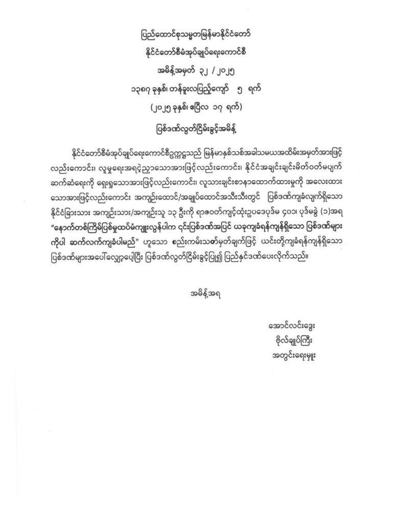 အလားတူ မြန်မာနှစ်သစ်မင်္ဂလာအခါသမယ အထိမ်းအမှတ်အားဖြင့်လည်းကောင်း၊ ပြည်သူလူထု နှလုံးစိတ်ဝမ်းအေးချမ်းစေရေးနှင့် လူမှုရေးအရ ငဲ့ညှာထောက်ထားသောအားဖြင့်လည်းကောင်း၊ နိုင်ငံတော်၏ မေတ္တာနှင့်စေတနာကို နားလည်စေရန် ရှေးရှုသောအားဖြင့် လည်းကောင်း ၂၀၂၅ ခုနှစ်၊ ဧပြီလ ၁၇ ရက်နေ့ မတိုင်မီ လူသတ်မှု၊ မုဒိမ်းမှု၊ ပေါက်ကွဲစေတတ်သော ဝတ္ထုပစ္စည်းများအက်ဥပဒေအရပြစ်မှုများ၊ မတရားအသင်းများအက်ဥပဒေအရပြစ်မှုများ၊ ၁၈၇၈ ခုနှစ် လက်နက်များအက်ဥပဒေပုဒ်မ ၁၉(စ) အရပြစ်မှုများ၊ ၁၉၄၉ ခုနှစ် လက်နက် (အရေးပေါ်ပြစ်ဒဏ် စီရင်မှု)(ယာယီ)အက်ဥပဒေအရပြစ်မှုများ၊ ၁၉၅၁ ခုနှစ် လက်နက်(ယာယီပြင်ဆင်ချက်) အက်ဥပဒေ အရပြစ်မှုများ၊ ၁၉၂၄ ခုနှစ် ရှမ်းပြည်နယ်လက်နက်အမိန့်အရပြစ်မှုများ၊ ၂ဝ၂၃ ခုနှစ် လက်နက်ဥပဒေ အရပြစ်မှုများ၊ မူးယစ်ဆေးဝါးနှင့်စိတ်ကိုပြောင်းလဲစေသောဆေးဝါးများဆိုင်ရာဥပဒေအရပြစ်မှုများ၊ သဘာဝဘေးအန္တရာယ်ဆိုင်ရာ စီမံခန့်ခွဲမှုဥပဒေအရပြစ်မှုများ၊ အကြမ်းဖက်မှုတိုက်ဖျက်ရေး ဥပဒေအရ ပြစ်မှုများနှင့် အဂတိလိုက်စားမှုတိုက်ဖျက်ရေးဥပဒေအရပြစ်မှုများမှအပ တည်ဆဲဥပဒေတစ်ရပ်ရပ်အရ ပြစ်မှုတစ်ခုခုနှင့် စပ်လျဉ်း၍ ပြစ်ဒဏ်ချမှတ်ခြင်းခံရပြီး အကျဉ်းထောင် / အချုပ်ထောင် / စခန်း အသီးသီးတွင် ပြစ်ဒဏ်ကျခံနေရသည့် အကျဉ်းသား/သူများကို နိုင်ငံတော်စီမံအုပ်ချုပ်ရေးကောင်စီ၏ အမိန့်အမှတ် (၃ဝ / ၂၀၂၅) ဖြင့် ယင်းတို့ ကျခံရန်ကျန်ရှိသော ပြစ်ဒဏ်၏ ခြောက်ပုံတစ်ပုံကို လွတ်ငြိမ်းသက်သာခွင့် ပြုလိုက်သည်။