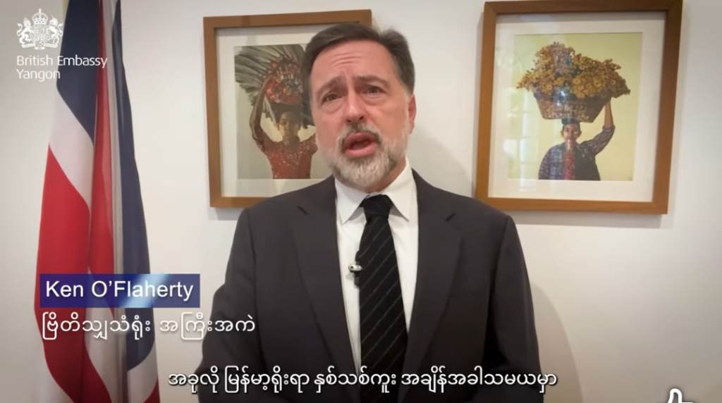 “အခုလို မြန်မာ့ရိုးရာ နှစ်သစ်ကူးအချိန်အခါသမယမှာဆိုးရွားလှတဲ့ ငလျင်ဒဏ်ခံခဲ့ရတဲ့ ပြည်သူများကို ကျွန်တော်နဲ့ လုပ်ဖော်ကိုင်ဘက်များအားလုံးက သတိတရရှိနေပါတယ်။ ငလျင်နဲ့ ၎င်းရဲ့နောက်ဆက်တွဲအခြေအနေများက လတ်တလောကာလအတွင်း ဆင်းရဲခက်ခဲမှုဒဏ် ခါးစည်းခံနေကြရတဲ့ မြန်မာပြည်သူပြည်သားများအတွက် ပိုမိုကြီးမားတဲ့ အခက်အခဲကို ဖြစ်စေပါတယ်။ အခုလိုအင်မတန်မှ ခက်ခဲတဲ့အချိန်ကာလမျိုးမှာတောင် တစ်ဦးနဲ့တစ်ဦးဖေးမကူညီနေကြတဲ့ မြန်မာပြည်သူပြည်သားများရဲ့ ခိုင်မြဲတဲ့ရဲစွမ်းသတ္တိနဲ့ ဝိုင်းဝန်းကူညီတတ်တဲ့ စိတ်ဓာတ်ကို ကျွန်တော်လေးစားမိပါတယ်။ ယူကေက မြန်မာပြည်သူများအား အကူအညီပေးဖို့ အခိုင်အမာ သိန္ဓိဌာန်ချမှတ်ထားဆဲဖြစ်ပါတယ်။ ငလျင်ဒဏ်သင့်ပြည်သူတွေကို ကူညီပေးဖို့အတွက် ယူကေအစိုးရက စတာလင်ပေါင် စုစုပေါင်း ၂၅ သန်းထိပံ့ပိုးပေးဖို့ ကတိကဝတ် ပြုထားပါတယ်”လို့ Ken O’ Flaherty က ဆိုပါတယ်။