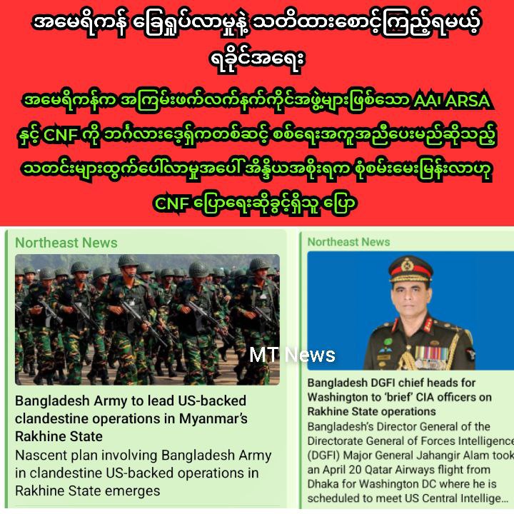 မြန်မာနိုင်ငံအကြောင်းကို အကျွမ်းတဝင်သိပုံမရတဲ့ အိန္ဒိယအခြေစိုက်သတင်းဌာန အငယ်တစ်ခုဖြစ်တဲ့ Northeast News ဟာ လက်ရှိကာလမှာ AA နဲ့ ရန်ဘက်ဖြစ်နေတဲ့ ARSA အပြင် ချင်းလက်နက်ကိုင် CAN/CNF တို့ကို အမေရိကန်နဲ့ ဘင်္ဂလားဒေ့ရှ်စစ်တပ်က တပ်ရင်းသုံးရင်း ပူးပေါင်းထောက်ပံ့ပြီး တပ်မတော်ကို အနိုင်ယူ ဖြိုခွင်းနိုင်တဲ့အထိ စစ်ရေးအထောက်အပံ့ဇုန်တစ်ခု ထူထောင်ဖို့ ဆွေးနွေးခဲ့တယ်လို့ ဧပြီ ၁၅ ရက်မှာ ဖော်ပြခဲ့တာပါ။