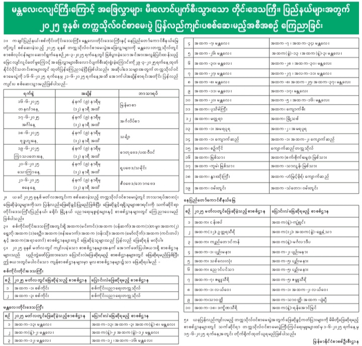 အဆိုပါဒေသများအတွက် တက္ကသိုလ်ဝင် စာမေးပွဲကို ၁၆-၆-၂၀၂၅ ရက်နေ့မှ ၂၁-၆-၂၀၂၅ ရက်နေ့အထိ ဖြေဆိုရမည်ဖြစ်ပြီး ဇွန်လ ၁၆ ရက်နေ့တွင် မြန်မာစာ၊ ၁၇ ရက်နေ့တွင် အင်္ဂလိပ်စာ၊ ၁၈ ရက်နေ့တွင် သင်္ချာ၊ ၁၉ ရက်နေ့တွင် ဓာတုဗေဒနှင့် ပထဝီဝင်၊ ၂၀ ရက်နေ့တွင် ရူပဗေဒနှင့် သမိုင်း၊ ၂၁ ရက်နေ့တွင် ဇီဝဗေဒနှင့် ဘောဂဗေဒတို့ကို နေ့စဥ် နံနက် ၉ နာရီမှ ၁၂ နာရီအတွင်း ဖြေဆိုရမည်ဖြစ်သည်။