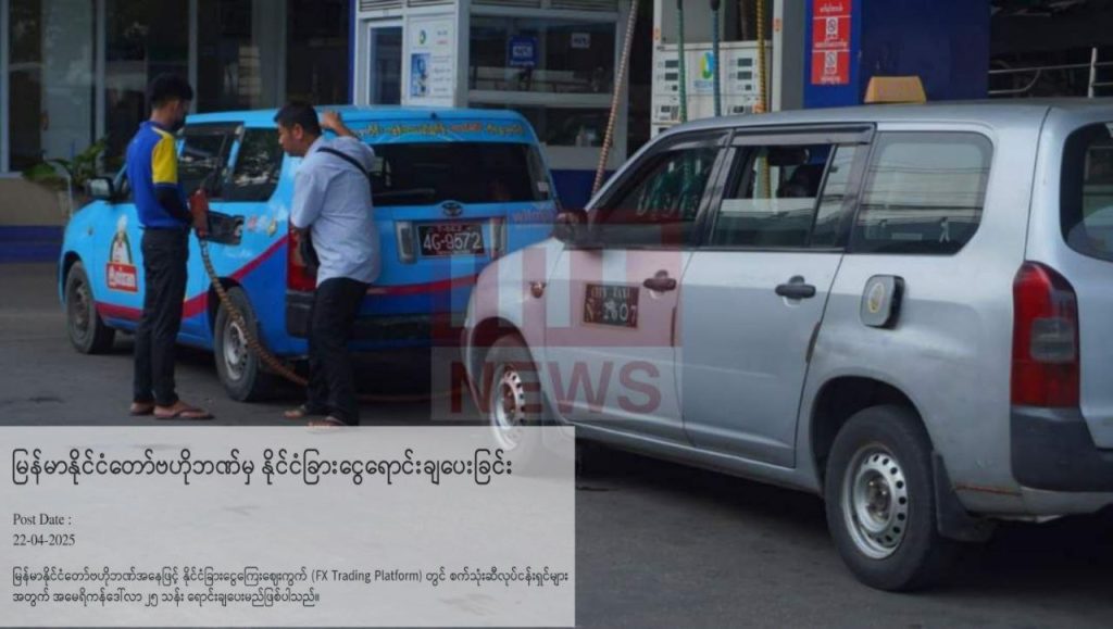 နိုင်ငံခြားငွေကြေးဈေးကွက် (FX Trading Platform) တွင် စက်သုံးဆီလုပ်ငန်းရှင်များအတွက် အမေရိကန်ဒေါ်လာ ၂၅ သန်း ရောင်းချပေးမည်ဖြစ်ကြောင်း မြန်မာနိုင်ငံတော်ဗဟိုဘဏ်က အသိပေးကြေညာထားသည်။