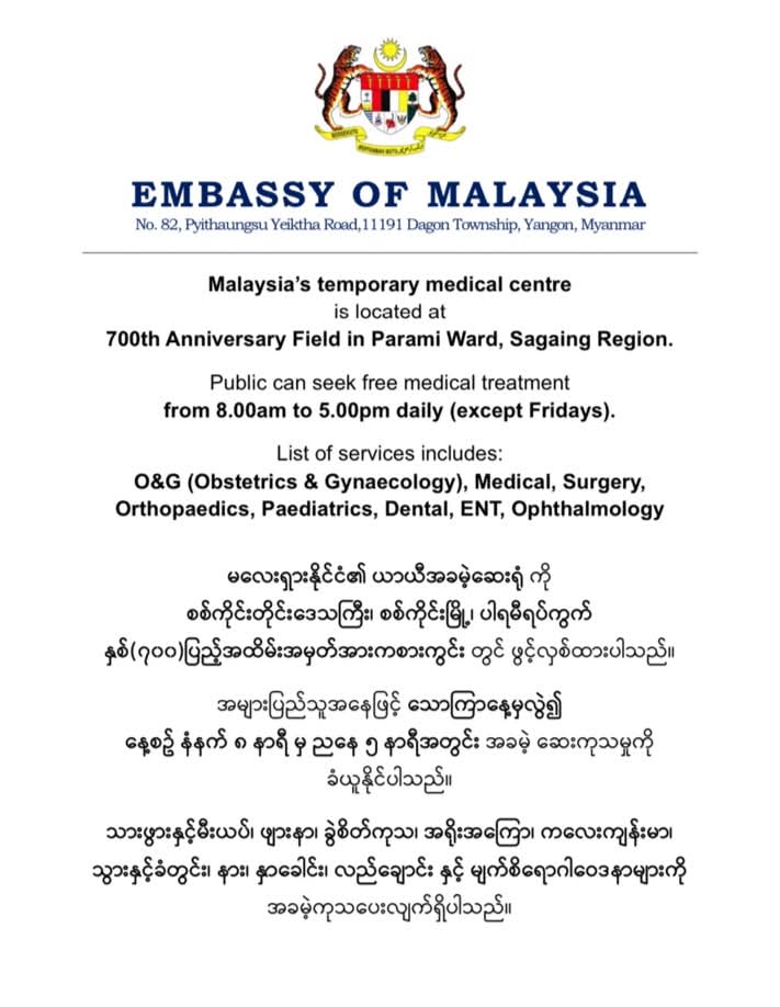 မန္တလေးငလျင်ကြီး၏ဒဏ် ပြင်းထန်စွာ ခံစားခဲ့ရသည့် မြန်မာပြည်သူများအတွက် စစ်ကိုင်းမြို့၊ ပါရမီရပ်ကွက်၊ နှစ် ၇၀၀ ပြည့် အထိမ်းအမှတ် အားကစားကွင်းအတွင်း အခမဲ့ ယာယီဆေးရုံဖွင့်လှစ်ကာ ဆေးကုသပေးနေပြီဖြစ်ကြောင်း မြန်မာနိုင်ငံဆိုင်ရာ မလေးရှားသံရုံးက ယနေ့ သတင်း ထုတ်ပြန်သည်။