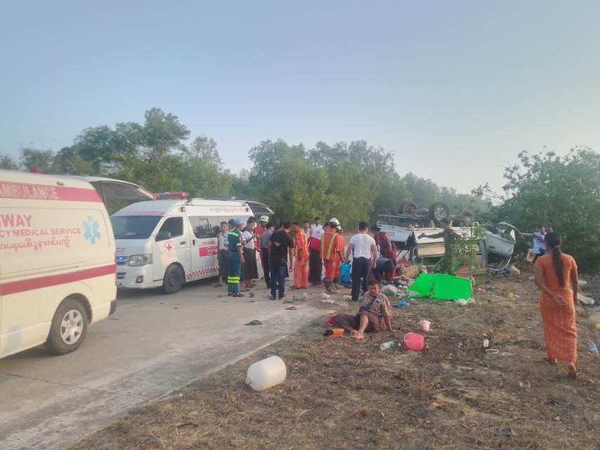 အမျိုးသား ၄ ဦး၊ အမျိုးသမီး ၁၀ ဦးတင်ဆောင်လာသည့် Town Ace အမျိုးအစား အဖြူရောင်မော်တော်ယာဉ်မှာ နေပြည်တော်ဘက်မှ မောင်းနှင်လာစဉ် ယာဉ်မောင်းအိပ်ငိုက်၍ အရှိန်မထိန်းနိုင်ဘဲ လမ်းလယ်ကျွန်းပေါ်ရှိ မန်ဂျန်းရှားပင်ကို ဝင်တိုက်ကာ တိမ်းမှောက်ခဲ့ခြင်းဖြစ်ကြောင်း သိရသည်။
