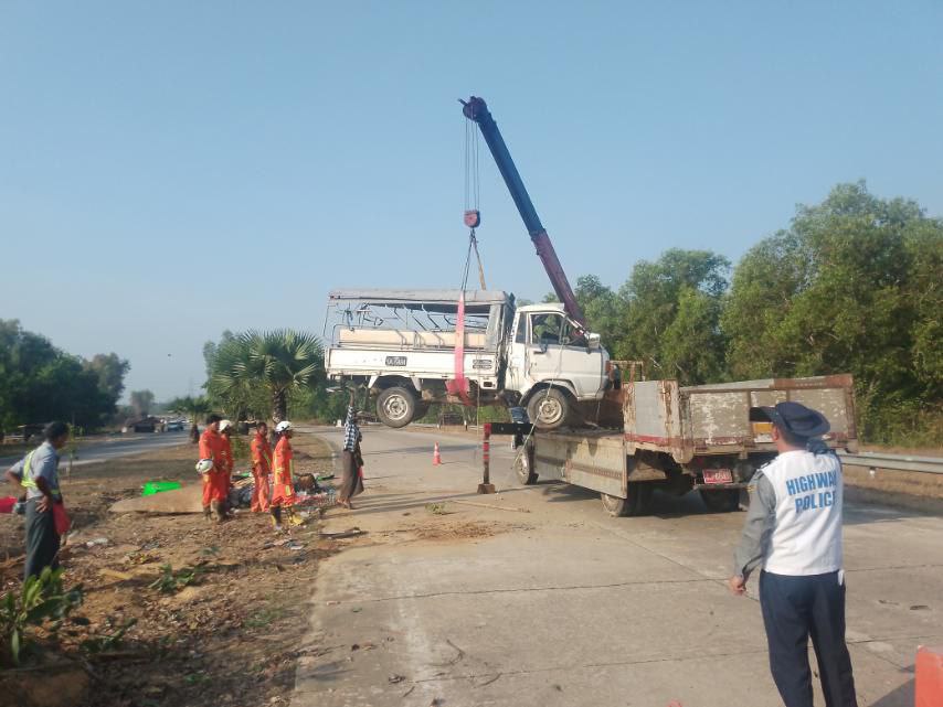 အမြန်လမ်းမကြီး နေပြည်တော် – ရန်ကုန်ဘက်ခြမ်း၊မိုင်တိုင် ၄၁ /၃၊ ၄၁/၄တွင် ဧပြီလ၂၇ ရက် နံနက် ၇ နာရီခွဲက ယာဉ်မောင်းအိပ်ငိုက်ရာက Town Ace မော်တော်ယာဉ် လမ်းလယ်ကျွန်းရှိ သစ်ပင်ကို ဝင်တိုက်မိလို့ တိမ်းမှောက်ကာ ၁၁ ဦးဒဏ်ရာရရှိခဲ့ကြောင်း အမြန်လမ်းမီးသတ်တပ်ဖွဲ့ထံမှ သိရသည်။
