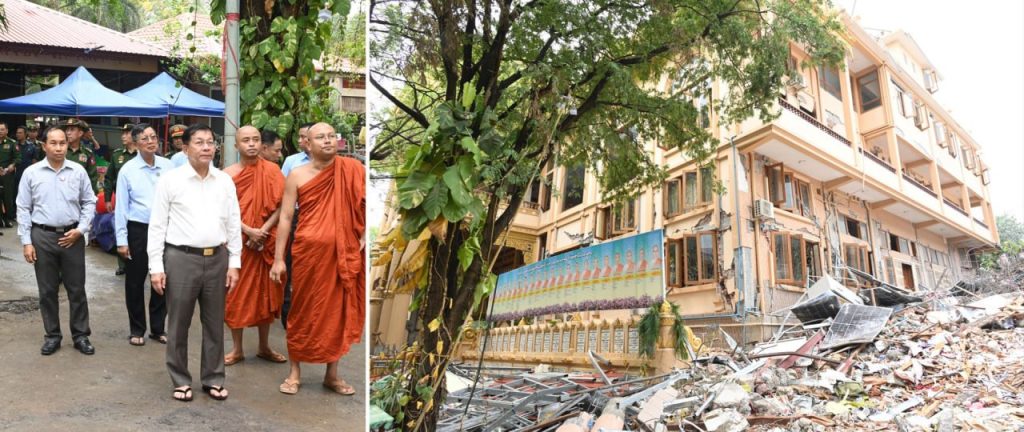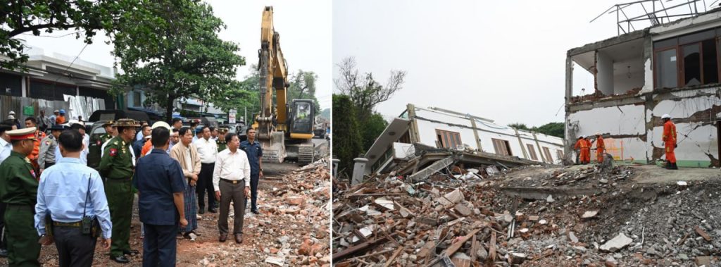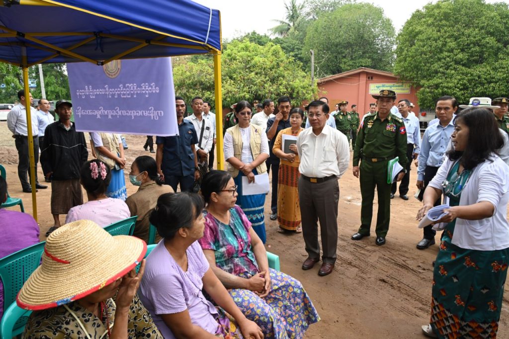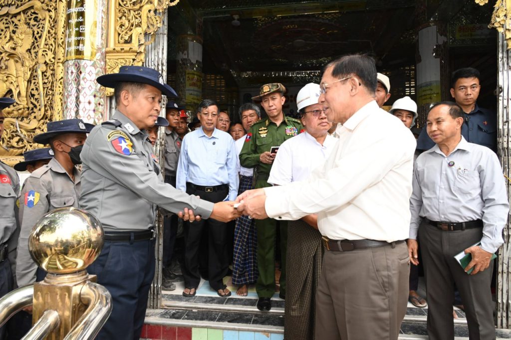 Chairman of State Administration Council Prime Minister Senior General Min Aung Hlaing, accompanied by wife Daw Kyu Kyu Hla, the SAC Joint Secretary and wife, SAC members, union ministers, senior military officers from the Office of the Commander-in-Chief, and other members of the entourage, inspected the extent of earthquake damage in Sagaing and ongoing rehabilitation undertakings this morning and attended to the needs.