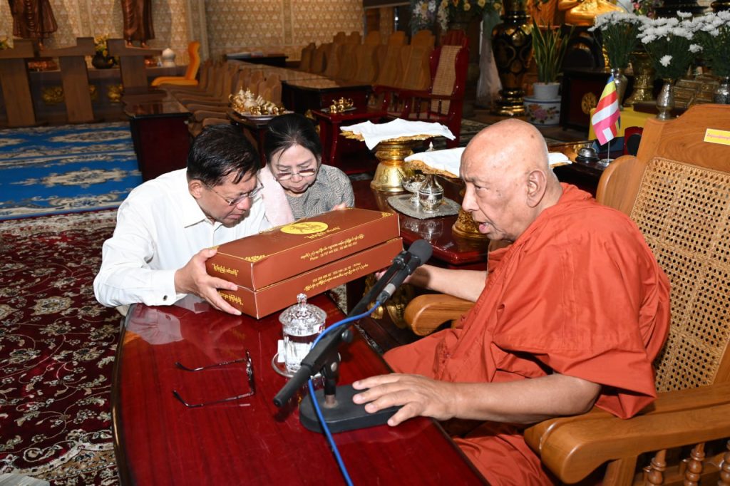 The Senior General and party proceeded to Sitagu Vipassana Monastery and paid respects to Abhidhaja Maha Rattha Guru Abhidhaja Agga Maha Saddhamma Jotika Sayadaw Dr Bhaddanta Nyanissara, State Ovadacariya Sayadaw Vice Sangha Raja of Shwekyin Nikaya, Chancellor of Sitagu International Buddhist Academies, and donated Ks-50 million for restoring the collapsed or damages pagodas, where Buddha’s relics were kept, and offertories. Then the merits gained were shared with monks, nuns and people who lost their life or limbs during the earthquake.