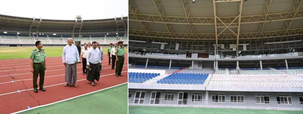 Chairman of State Administration Council Prime Minister Senior General Min Aung Hlaing, accompanied by SAC Joint Secretary General Ye Win Oo and members of the entourage, inspected the damage caused to the indoor stadiums of Nay Pyi Taw Wunna Theikdi Sports Complex by the recent earthquake in Mandalay this evening.
