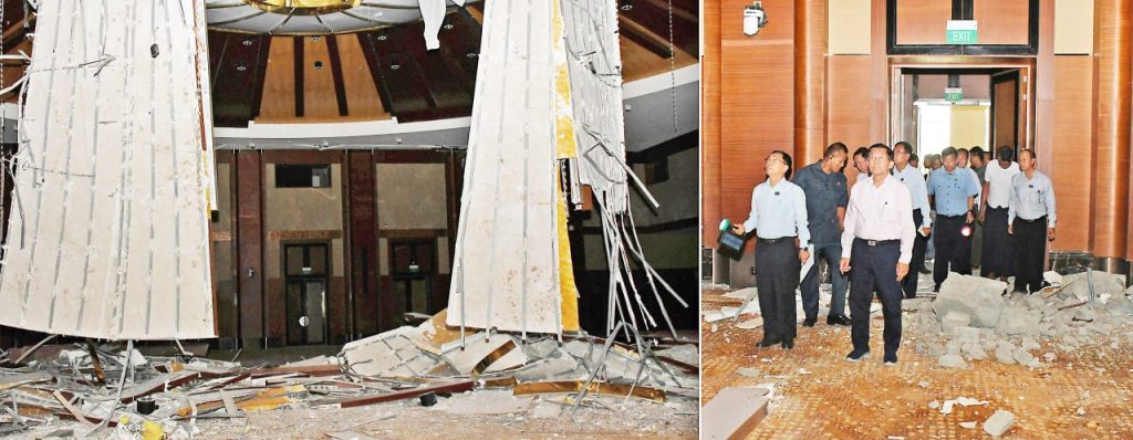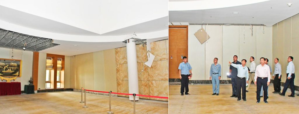 Accompanied by SAC Secretary General Aung Lin Dway, Union Minister U Myo Thant and officials, the Senior General examined the slight damages caused by the earthquake at the ceiling at the entrance of the main hall of MICC-I, the ceilings of Jade Hall, Ruby Hall, and Emerald Hall and and minor damages of the walls of meeting rooms and gave directives.