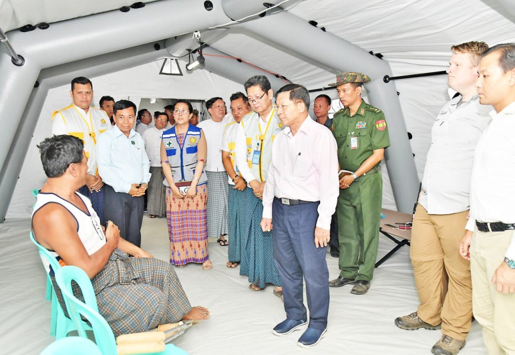 At a temporary mobile hospital, run by the US-based Samaritan’s Purse International Relief Organization, at Shwekyabin Ward, Zabuthiri Township, the Senior General, while looking around the facility, heard a report on operations of the hospital including surgical operations on patients presented by hospital in charge Dr. Elliott Tenpenny.