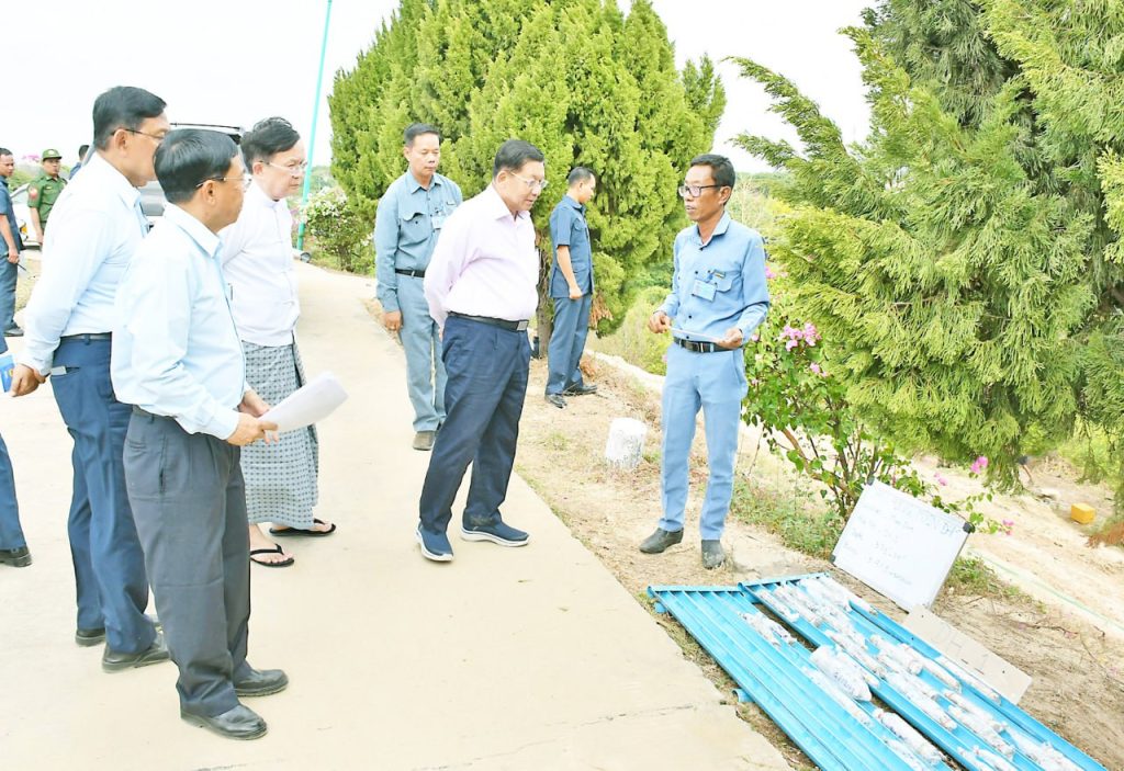 At the Yanaungmyin reservoir in Dekkhinathiri Township, the Senior General checked the temporary repair of the cracks at the dam, the work of filling the cracks with sand and earth, and soil testing. As regards the reports on points of the reservoir, strength of the dam, and appearance of cracks due the earthquake, the Senior General pointed out the need to complete the dam before the onset of monsoon, green the watershed areas, and take essential steps for the thriving of the planted trees. He also attended to the other needs.