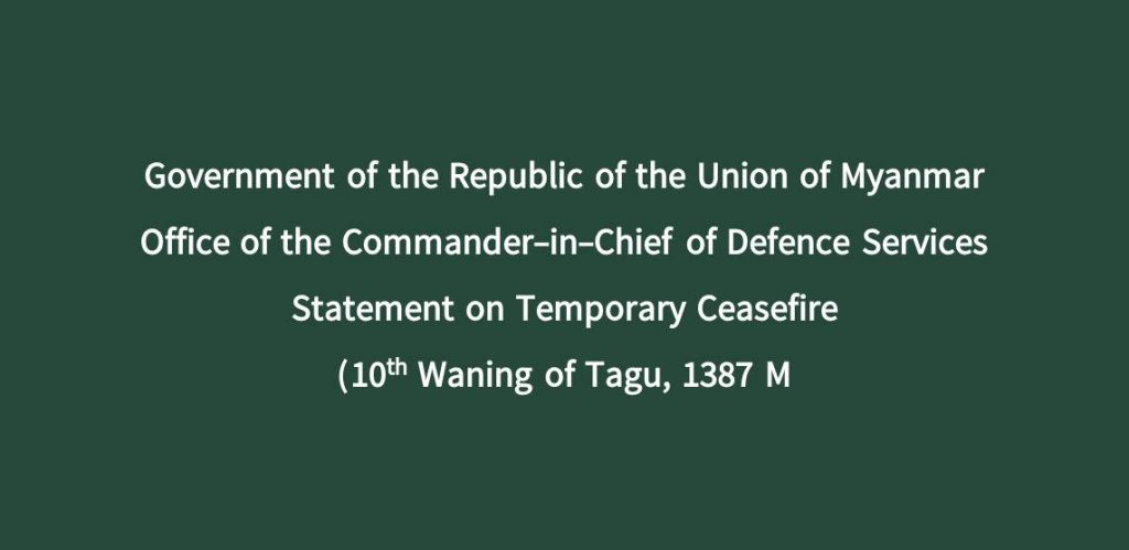 - In this regard, the Tatmadaw extends the temporary ceasefire period from 23 to 30 April 2025 in order to facilitate rehabilitation and reconstruction activities in earthquake-affected areas, to serve the interest of the nation and people with greater acceleration, to achieve genuine and long-lasting peace and in view of peace and stability.