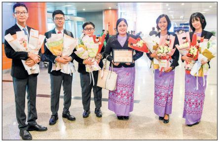 Myanmar students from No. 1 BEHS (Dagon) were welcomed by the officials of school, the parents and concerned officials at the Yangon International Airport.