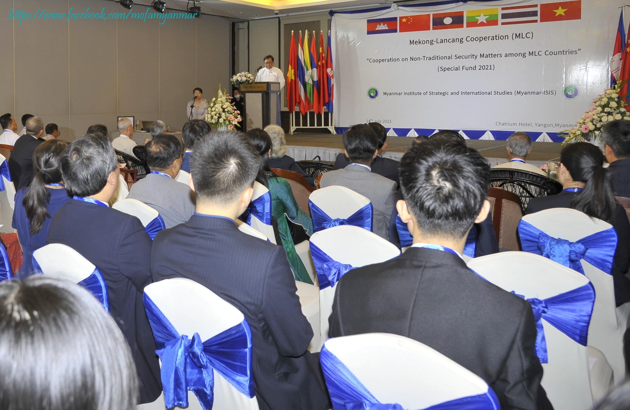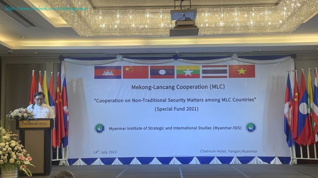 A Seminar organized by the Myanmar Institute of Strategic and International Studies under the auspices of the Mekong-Lancang Cooperation (MLC) on Non-traditional Security Matters among Mekong Lancang Countries was held at Chatrium Hotel in Yangon on 14 July 2023. Members of the Myanmar-ISIS, professors and research fellows from the respective Think Tanks of Cambodia, Laos, Vietnam, Thailand and China participated in the seminar.