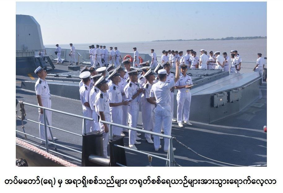 The senior military officers of the Tatmadaw (Navy) who went on a study tour to naval vessels were welcomed and conducted round by Senior Captain Sun Bo, head of naval vessels and in-charge troops on the vessel. Then, they posed for documentary group photos together.