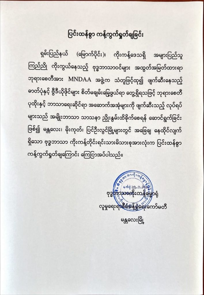 Buddhist Kokang ethnic families, who are living in Mandalay, Mogok, and Pyin Oo Lwin cities, have issued strong objections to the actions of the MNDAA terrorist group that insulted Buddhism.