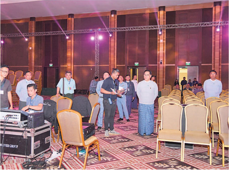 Union Minister of Information U Maung Maung Ohn, Chairman of the Steering Committee for the 2023 Myanmar Film Award Ceremony, Deputy Minister U Ye Tint, Myanmar Film Association President U Kyi Soe Tun, and officials inspected the preparations at the Myanmar International Convention Center-1 in Nay Pyi Taw, where the ceremony will be held.
