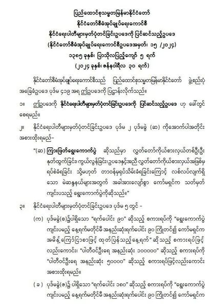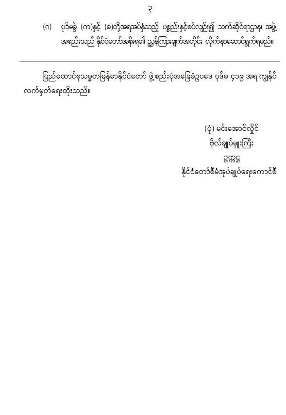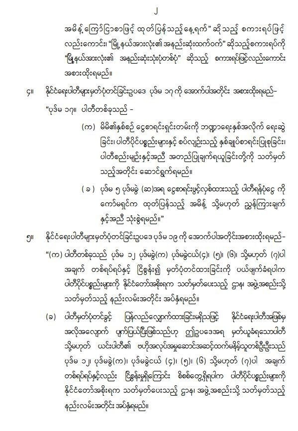 In the law amending the Political Parties Registration Law, the day the commission issued a notification at least 90 days in advance before the election will be substituted instead of 180 days, and at least one-third of the townships instead of at least half of the townships. Moreover, it substituted section 17, section 2 sub-section (g), and section 19 sub-section (a).