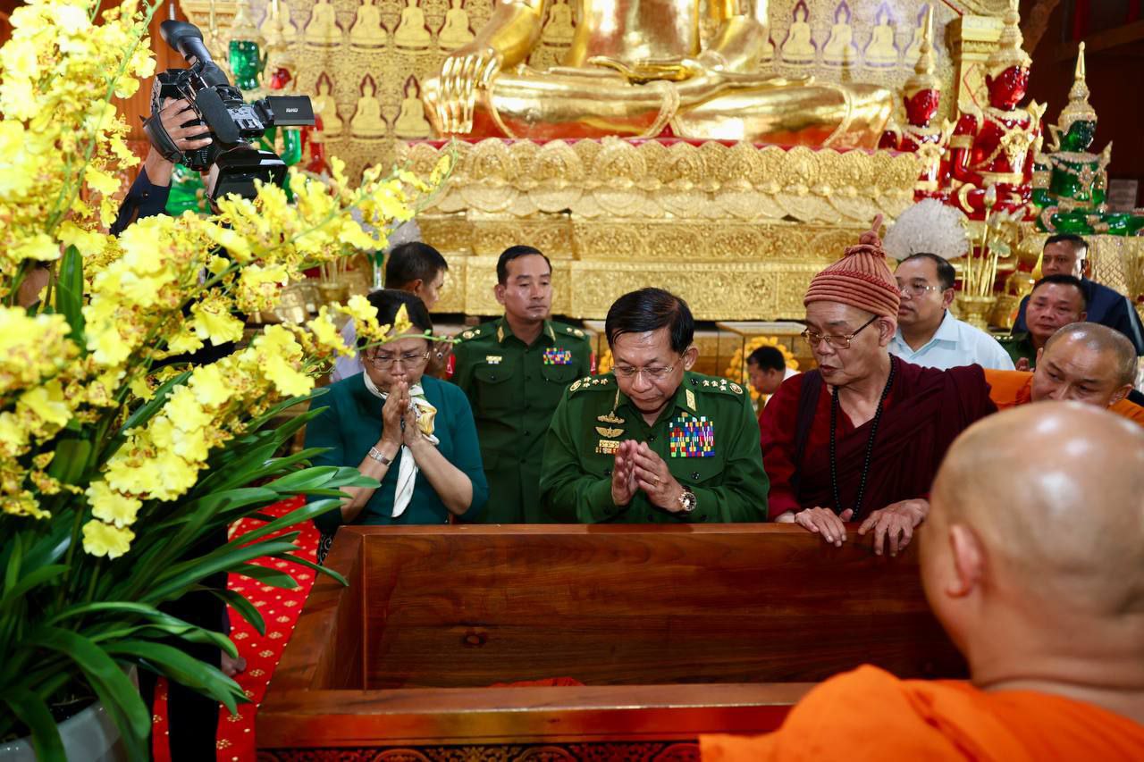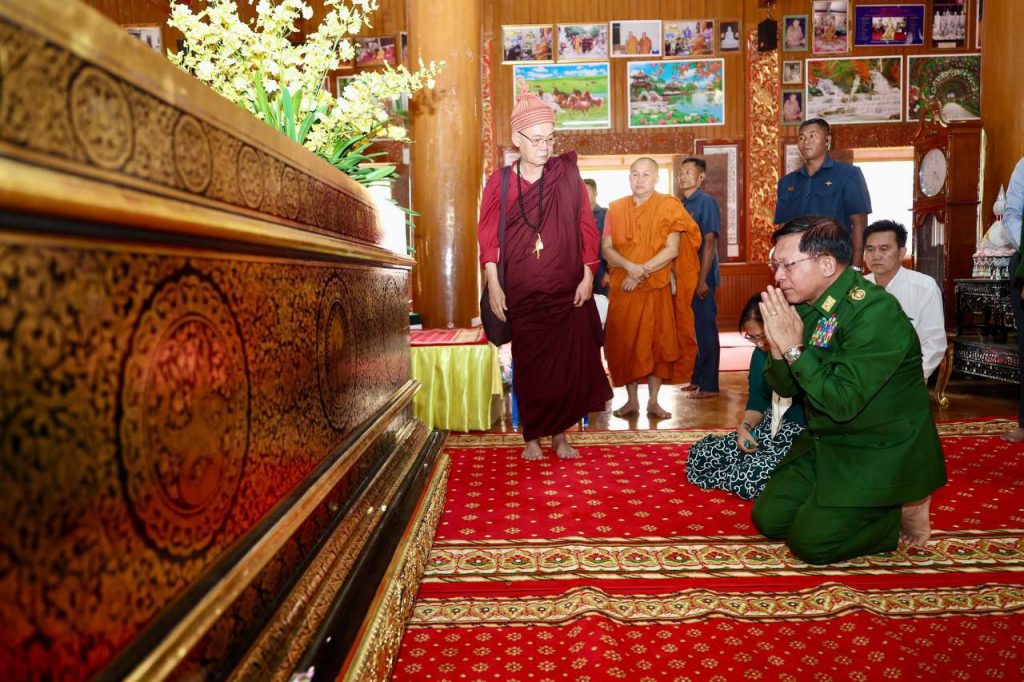 Chairman of State Administration Council Commander-in-Chief of Defence Services Senior General Min Aung Hlaing and wife Daw Kyu Kyu Hla, accompanied by Lt-Gen Ye Win Oo from Office of Commander-in-Chief and wife, senior military officers from Office of Commander-in-Chief and wives, the Triangle Region Command commander and officials, paid respects to the remains of the Sayadaw, placed at the monastery, this afternoon.