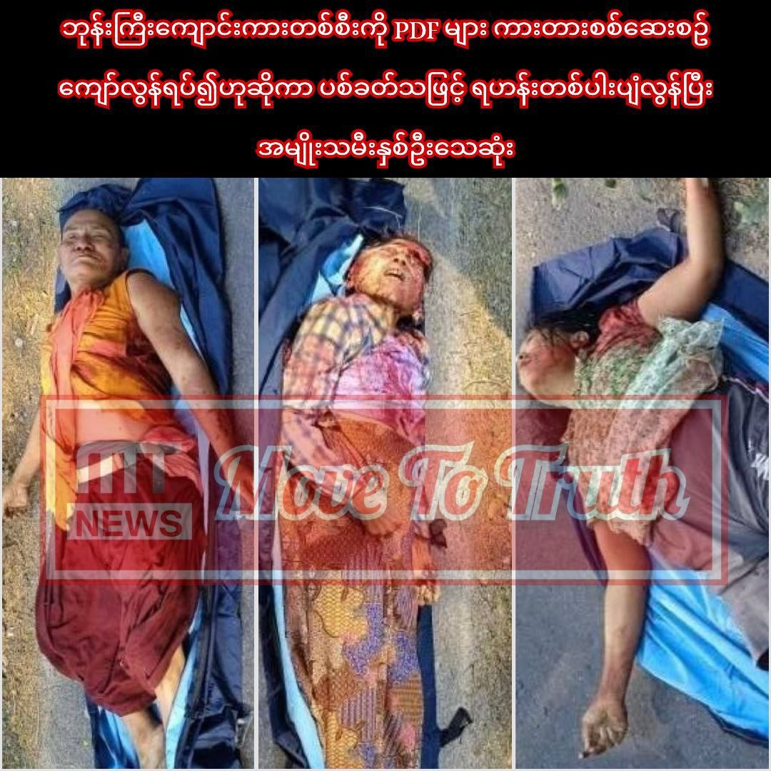 According to local news reports, on 22 February, in Natogyi Township, Mandalay Division, about 15 terrorist (PDF) who were blocking the road and robbeted from civilian passengers killed the monk and two civilian women.