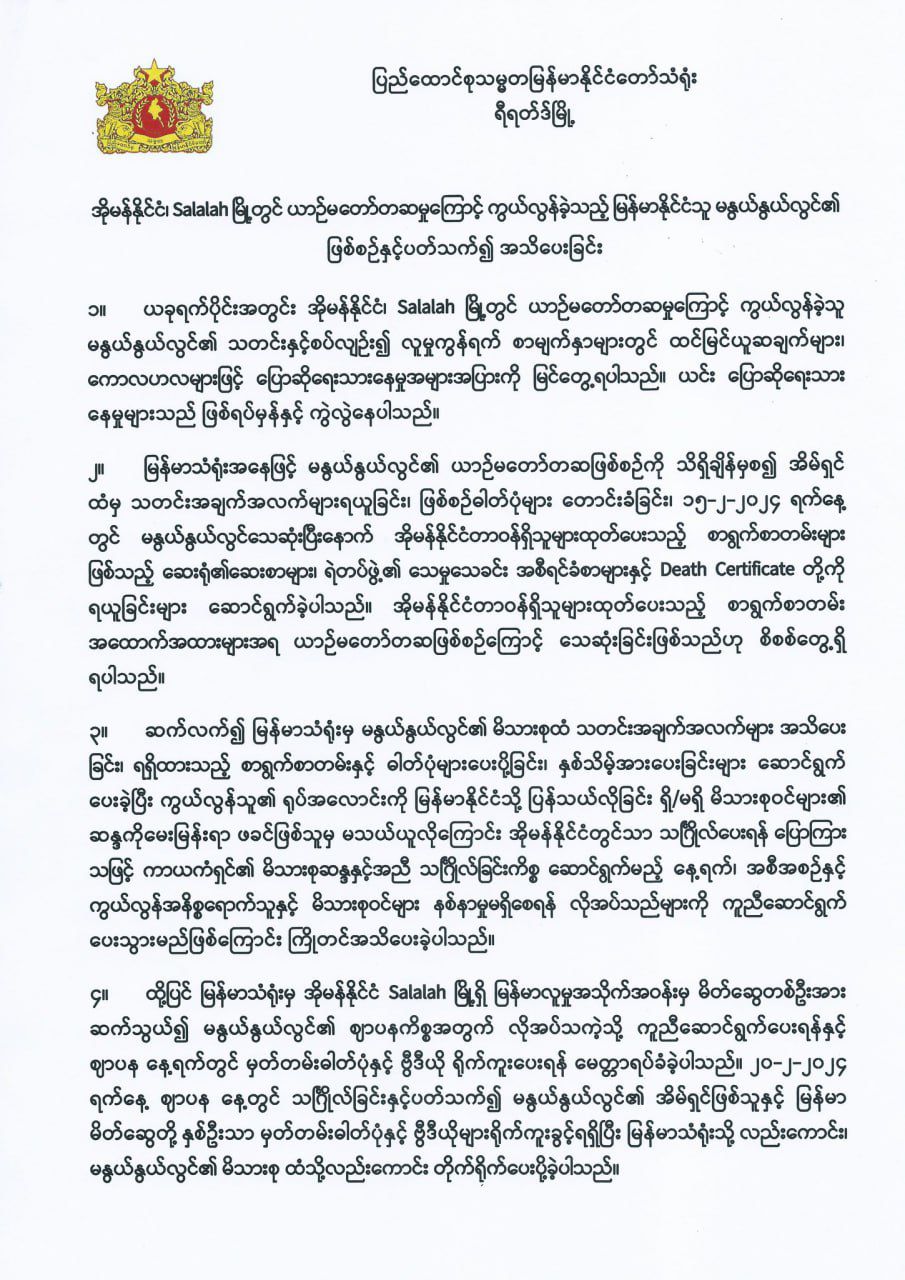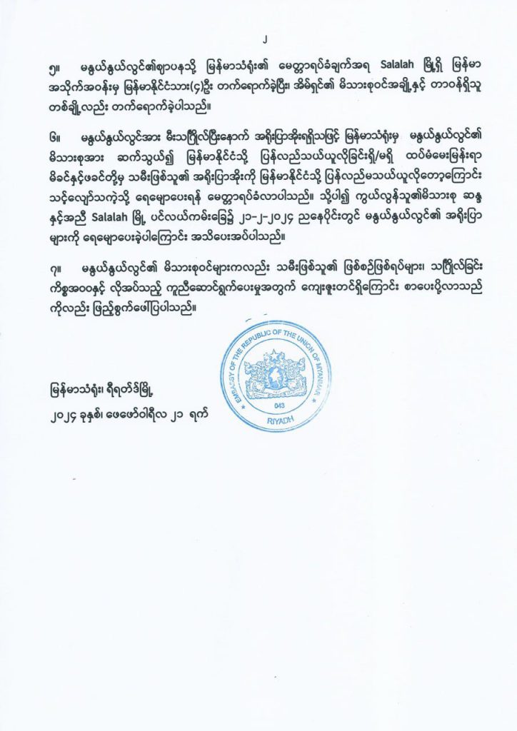 The Myanmar Embassy in Saudi Arabia has issued an announcement on the true story of Ma Nwe Nwe Lwin, who died a few days ago in Salalah, Oman.