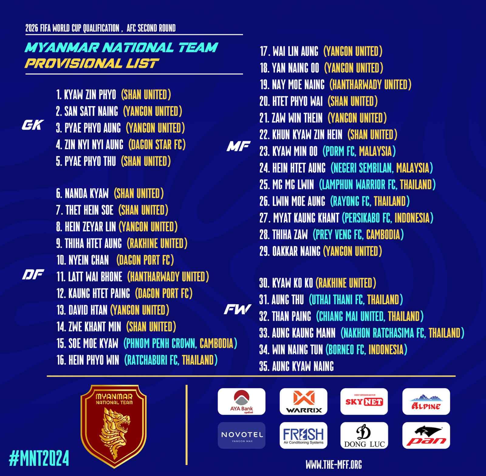 The head coach of the Myanmar national team, Michael Feitenbiner, announced the preliminary list of 35 Myanmar national team players for the 2026 World Cup qualifying matches against the Syrian team. The list includes 22 players from local clubs. There are 13 players from Thailand, Cambodia, Malaysia, Indonesia and Bhutanese leagues and they will start training on March 11.