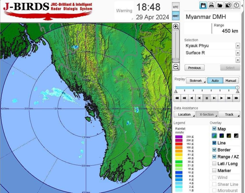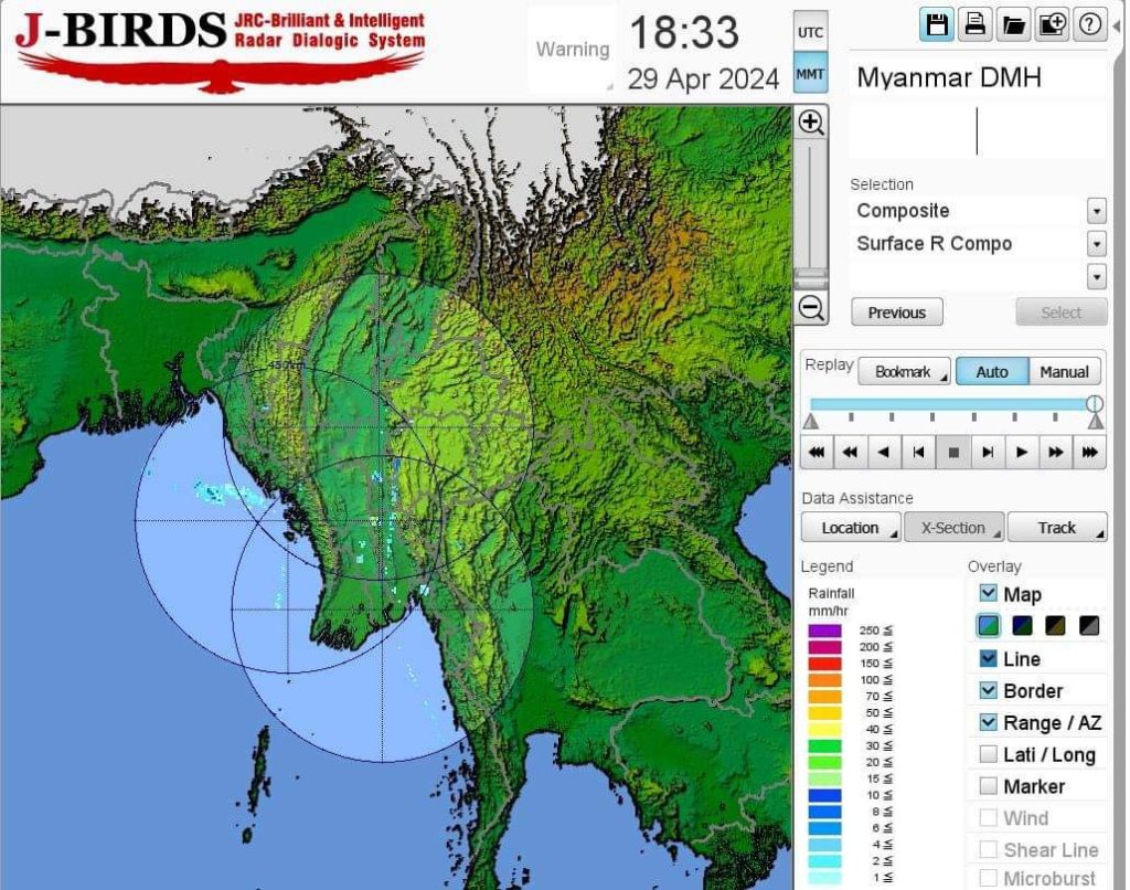 According to the observations at (15:30) hrs MST today, due to Western disturbances and development of convective clouds, rain or thundershowers are likely to be fairly wirdespread upper Sagaing Region and Kachin State. According to the Department of Meteorology and Hydrology, there will be scattered thunderstorms in Nay Pyi Taw, Lower Sagaing Region, Mandalay Region, Magway Region, Bago Region, Yangon Region, Irrawaddy Region, Tanintharyi Region, Shan State, Chin State, Rakhine state, Kayah State, Karen State and Mon State.