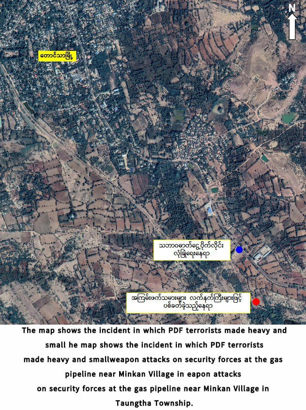 This morning, the PDF terrorists came and attacked the security forces who were working to secure the pipeline near Minkan Village, Taungtha Township, Mandalay Region, with heavy and small arms from about 300 meters south of the natural gas pipeline with the intention of disrupting and destroying the natural gas pipeline. As a result, the security forces returned fire and the terrorists retreated to the east.