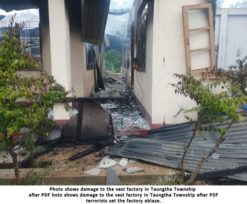 In addition, PDF terrorists arrived at the Taungtha singlet factory under the Ministry of Industry, about 2,000 meters north of Taungtha Township, on seven motorcycles at noon today. The factory gate was smashed and the factory management office and 2 vehicles belonging to the office were burnt. After that, they took three motorcycles owned by the factory workers and returned back the way they came. The factory workers were not injured in the incident.