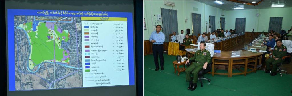 The Senior General emphasized that excavation and research on the city’s walls should be conducted systematically by experts. He stated that the restoration and preservation of city walls, gates, and bridges should be carried out in accordance with available information, prioritizing the renovation of moats and bridges. Subsequently, the city walls and royal palace sites should be maintained and restored step by step. Government buildings that need to be relocated should be moved, and designated cultural heritage sites should be preserved in accordance with the law. Regarding the construction of a new prison, he mentioned that it should be built systematically, adhering to security measures and standard guidelines. Similarly, the construction of new railway tracks and stations should be done with long-term durability in mind, ensuring quality at each stage according to the set standards. When developing new townships, green areas should be pre-planned along the roadsides to allow for tree planting. In the Taungoo region, he suggested that cultivating additional crops could bring more benefits to the area, aiming to increase agricultural output by 200 percent. Agricultural activities should follow the four principles: seeds, soil, water, and methods, to improve per-acre yields. To support food security, he mentioned the importance of rearing layer chickens and broiler chickens, as well as feeding and raising native chickens, cattle, and pigs systematically. Additionally, dairy farming should be expanded.