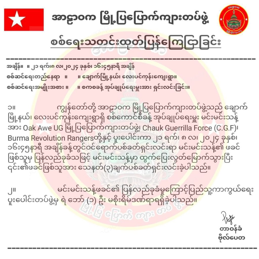 During three groups of PDF attempted to kill the governor of Lay Pin Gone village, Chauk Township, the Administrator’s father resisted the PDF terrorists and as a result, he were shot and killed by the PDF.
