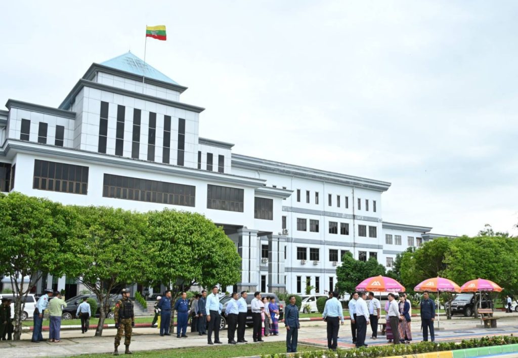 On arrival at Western Yangon University, the Senior General and party inspected dredging of a lake with 665 feet in length, 110 feet in width and five feet in depth in front of the four storey main lecture building, greening landscaping around the lake, filling water into the lake and installation of water foundations with the use of solar power, paving the pedestrian along the bund, beautification process in the university. The Yangon Region Chief Minister, the Yangon Mayor and the Rector of the university explained all work processes to the Senior General.