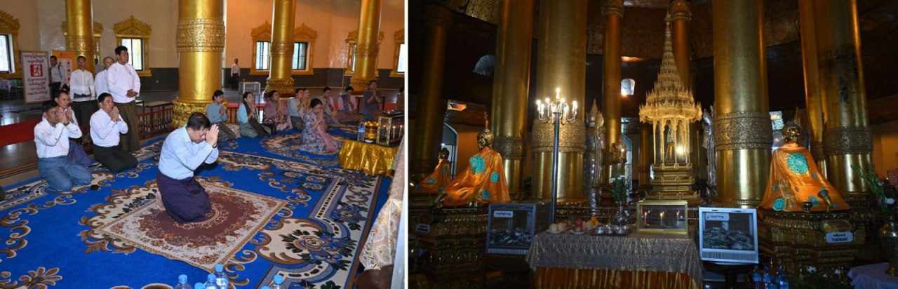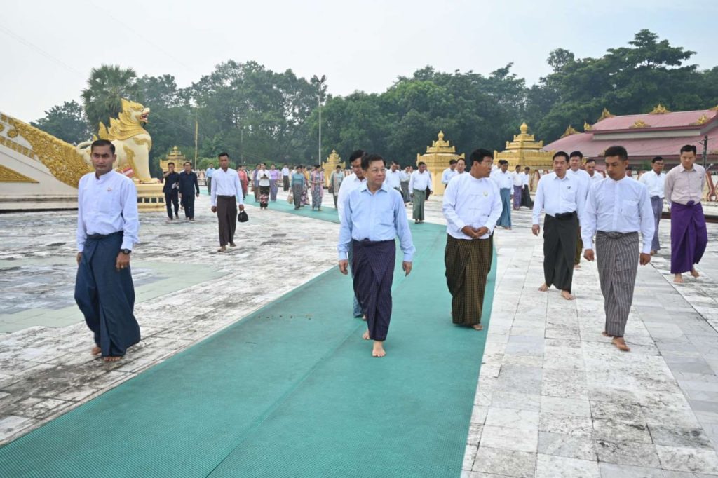 Chairman of the State Administration Council Prime Minister Senior General Min Aung Hlaing and wife Daw Kyu Kyu Hla, accompanied by their entourage and officials, paid obeisance to the Swe Taw Myat Pagoda (Yangon) built on Dhamma Pala hill in Mayangone Township in Yangon Region this morning.