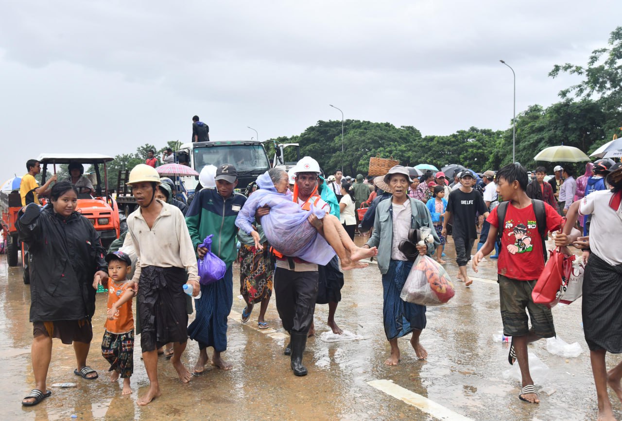 Flood victims are rescued and evacuated by Tatmadaw personnel, police, firefighters, personnel from executive bodies, the Myanmar Red Cross Society, civic organizations and the public with boats.