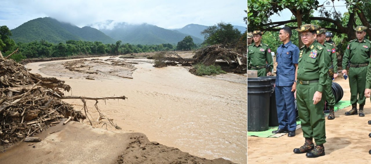 Chairman of the State Administration Council Commander-in-Chief of Defence Services Senior General Min Aung Hlaing this morning, accompanied by member of the SAC Chief of the General Staff (Army, Navy and Air) General Maung Maung Aye, Commander-in-Chief (Navy) Vice-Admiral Htein Win, senior military officers from the Office of the Commander-in-Chief, the commander of Nay Pyi Taw Command and officials, inspected military headquarters in Tatkon Station which faced batter impacts of flash flood, gave necessary instructions and presented relief supplies.