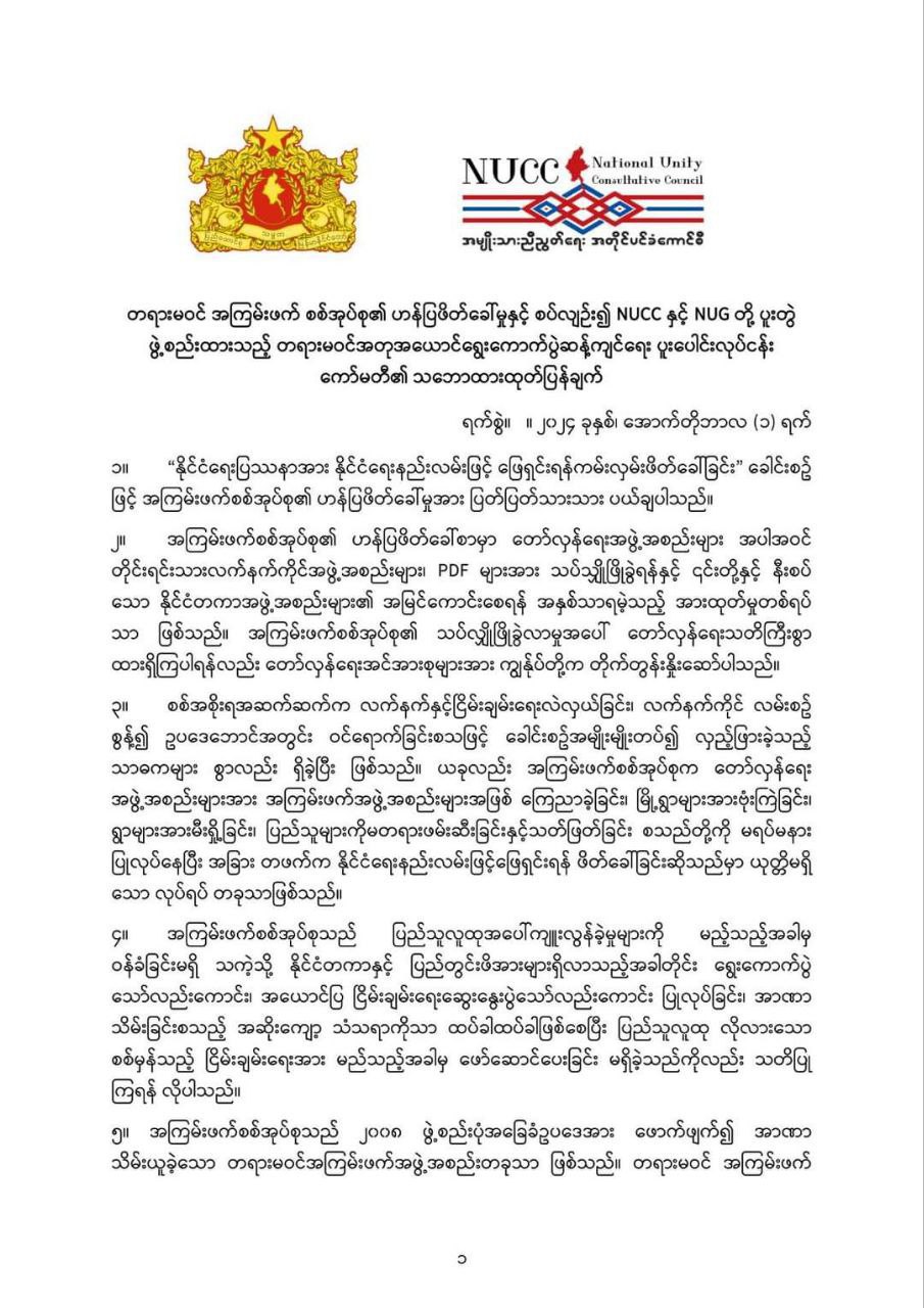 The NUCC and NUG announced today that they have categorically rejected the “invitation to resolve the political problem by political means” invited by the SAC government and that they will fight the election.