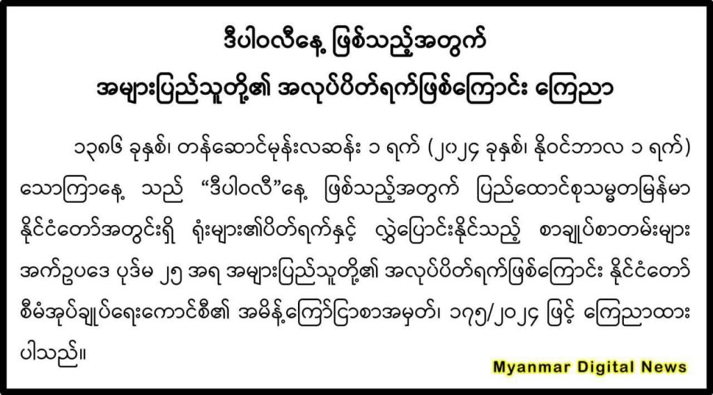 In 1386, the State Planning and Administration Council announced Proclamation No. 175/2024, declaring the 1st day of the Tasaung Mone new moon (November 1, 2024) as Diwali Day. Consequently, it is recognized as a public holiday by Section 25 of the Negotiable Contracts Act and is a holiday for offices throughout the Union of Myanmar.