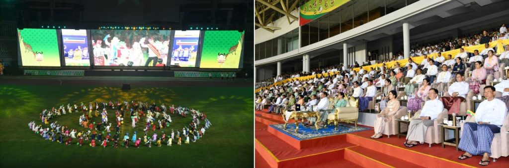 Afterward, the Senior General and wife and attendees enjoyed group dances covering six historical eras of Myanmar performed by artists from the Fine Arts Department of the Ministry of Religious Affairs and Culture and music and performances of members of Myanmar Paralympic Sports Federation, Myanmar Motion Picture Association, Myanmar Chinlon Federation and Myanmar Comedians Association and students from Nationalities Youth Resource Development Degree College.