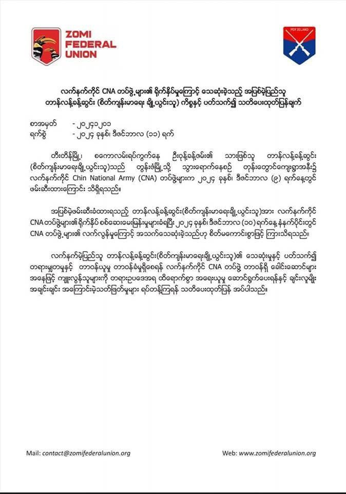 Regarding the brutal killing of the unarmed and mentally stable Tan Lann Khun, the Zomi Federal Union has issued a statement calling for accountability and justice. The Zomi Federal Union demands that those responsible, including leaders within the CNA forces, be held accountable under the law and that effective action be taken to ensure justice. Furthermore, the Union has urged an end to indiscriminate killings among the Chin people.