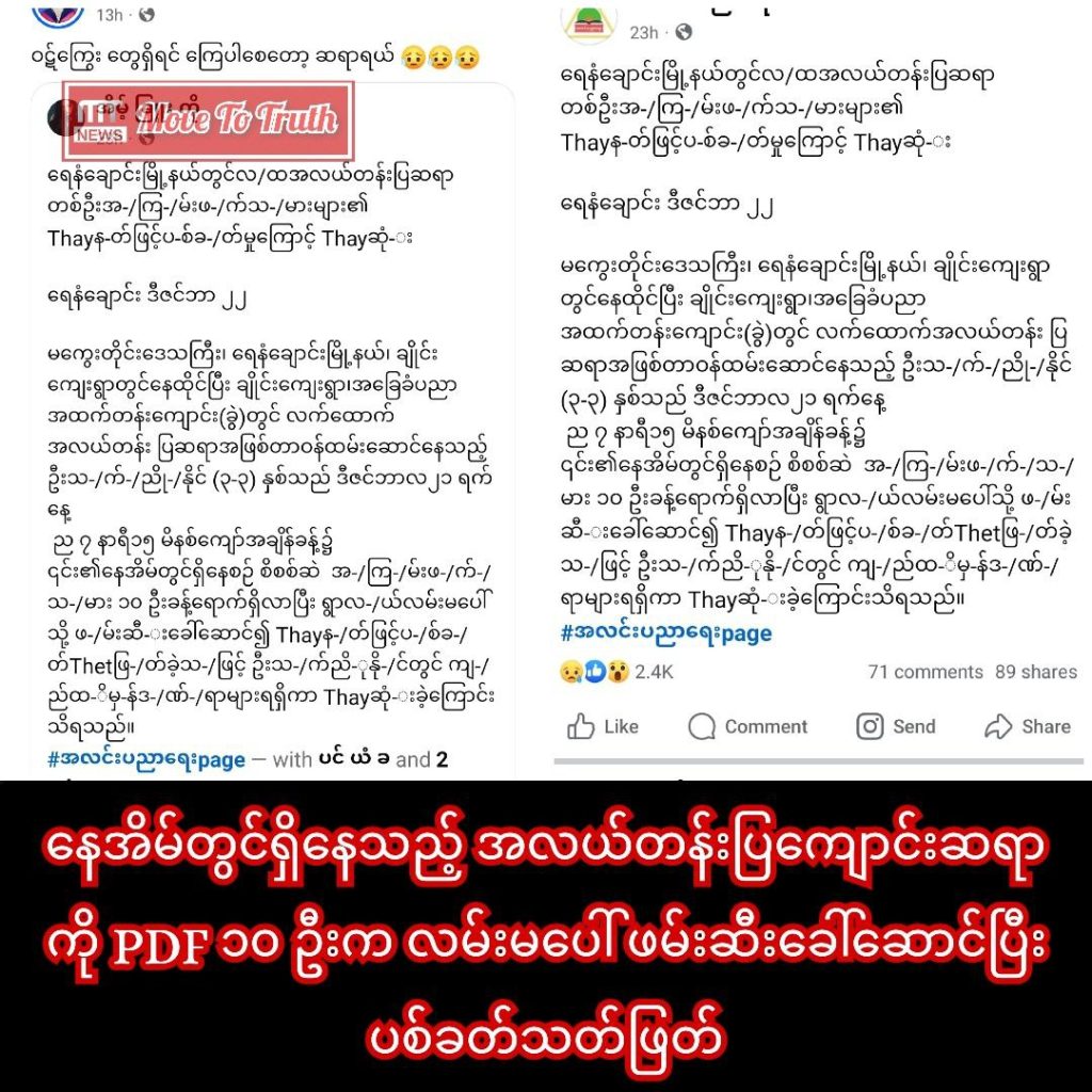 Since the start of the Spring Revolution until the end of July 2024, over 230 children, more than 90 monks, and approximately 1,200 civil servants—including village administrators, teachers, and government staff—have been killed. Around 8,000 civilians have been accused of being “dalans,” or spies and collaborators for the military junta, and have been killed by the NLD (National League for Democracy), NUG (National Unity Government), PDFs, and EAOs (Ethnic Armed Organizations).