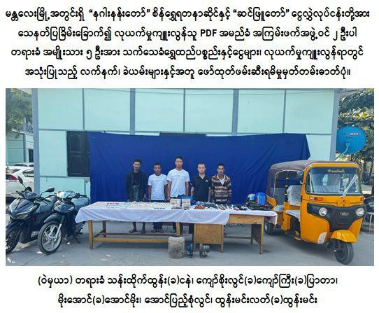 MT News၃၁. ၁၂. ၂၀၂၄ မန္တလေးမြို့အတွင်းရှိ “နဂါးနန်းတော်” စိန်ရွှေရတနာဆိုင်နှင့် “ဆင်ဖြူတော်” ငွေလွှဲလုပ်ငန်းတို့အား သေနတ်ပြခြိမ်းခြောက်၍ လုယက်မှုကျူးလွန်သူ PDF ၂ ဦးပါ တရားခံ အမျိုးသား ၅...