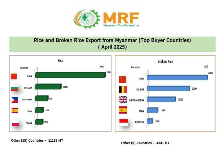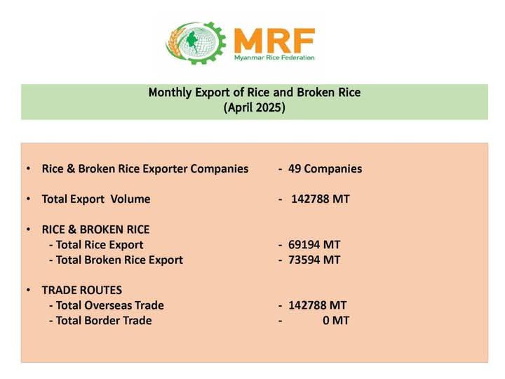 ယခု ၂၀၂၅-၂၀၂၆ ဘဏ္ဍာနှစ် ဧပြီလအတွင်း ပြည်ပသို့ ဆန်နှင့်ဆန်ကွဲ စုစုပေါင်းတန်ချိန် ၁၄၂,၇၈၈ တန် တင်ပို့ခဲ့ပြီး နယ်စပ်လမ်းကြောင်းမှ တင်ပို့နိုင်ခြင်းမရှိသော်လည်း တရုတ်နိုင်ငံသို့ ဆန်နှင့်ဆန်ကွဲနှစ်မျိုးလုံး အများဆုံးတင်ပို့ထားကြောင်း မြန်မာနိုင်ငံဆန်စပါးအသင်းချုပ်မှ ထုတ်ပြန်ထားသည်။