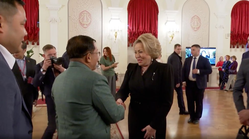 SAC ဥက္ကဋ္ဌနှင့် ဇနီး၊ အဖွဲ့ဝင်များသည် State Academic Bolshoi Theatre သို့ ရောက်ရှိကြရာ ရုရှားဖက်ဒရေးရှင်းနိုင်ငံ ဖက်ဒရယ်ကောင်စီလွှတ်တော်ဥက္ကဋ္ဌ Mrs. Valentina Matvienko နှင့် တာဝန်ရှိသူများက ကြိုဆိုနှုတ်ဆက်ခဲ့ပြီးနောက် SAC ဥက္ကဋ္ဌနှင့် ဇနီး၊ အဖွဲ့ဝင်များသည် ရုရှားဖက်ဒရေးရှင်းနိုင်ငံ ဖက်ဒရယ်ကောင်စီ လွှတ်တော်ဥက္ကဋ္ဌနှင့် ရုရှားဖက်ဒရေးရှင်းနိုင်ငံမှ တာဝန်ရှိသူများ၊ အထိမ်းအမှတ်ကပွဲသို့ လာရောက်ကြည့်ရှုကြသူများနှင့်အတူ ၁၉၄၁-၁၉၄၅ မဟာ မျိုးချစ်စစ်ပွဲကြီးအောင်ပွဲ နှစ်(၈၀)ပြည့်အထိမ်းအမှတ်အဖြစ် “The Young Lady and The Hooligan” ဘဲလေးအကဖြင့် ကပြဖျော်ဖြေမှုအား ကြည့်ရှုအားပေးကြခဲ့သည်။