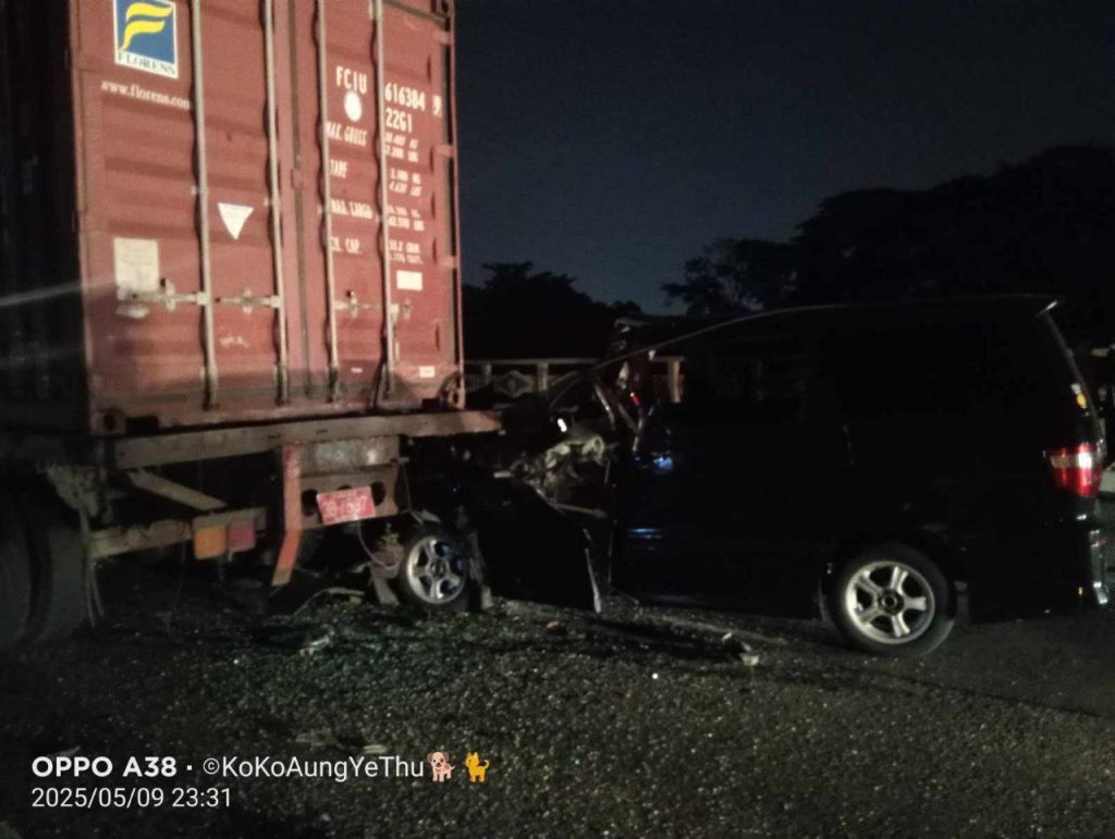 မြစ်ကူးတံတားအလယ်၊ လမ်းလယ်ခေါင်မှာ ကားပျက်လို့ ရပ်ထားတဲ့ ကွန်တိန်ယာဉ်ကို လူသုံးဦး လိုက်ပါစီးနင်းလာတဲ့ Alphard ယာဉ်က နောက်ကနေဝင်တိုက်တာကြောင့် နှစ်ဦးပြင်းထန်ဒဏ်ရာတွေရရှိကာ ဆေးရုံတင်ပို့ကုသမှုခံယူနေရတဲ့ဖြစ်စဉ် မနေ့က မေလ ၉ ရက်နေ့ ည ဆယ့်တစ်နာရီကျော် အချိန်မှာ ရန်ကုန်မြို့၊ ဒေါပုံမြို့နယ် ဘက်အခြမ်း၊ မဟာဗန္ဓုလ တံတားပေါ်မှာ ဖြစ်ပွားခဲ့တယ်လို့ မြေပြင်အကူအညီသွားရောက်ခဲ့တဲ့ အောင်ရဲသူ လူမှုကူညီရေးအသင်းထံကနေ သိရပါတယ်။