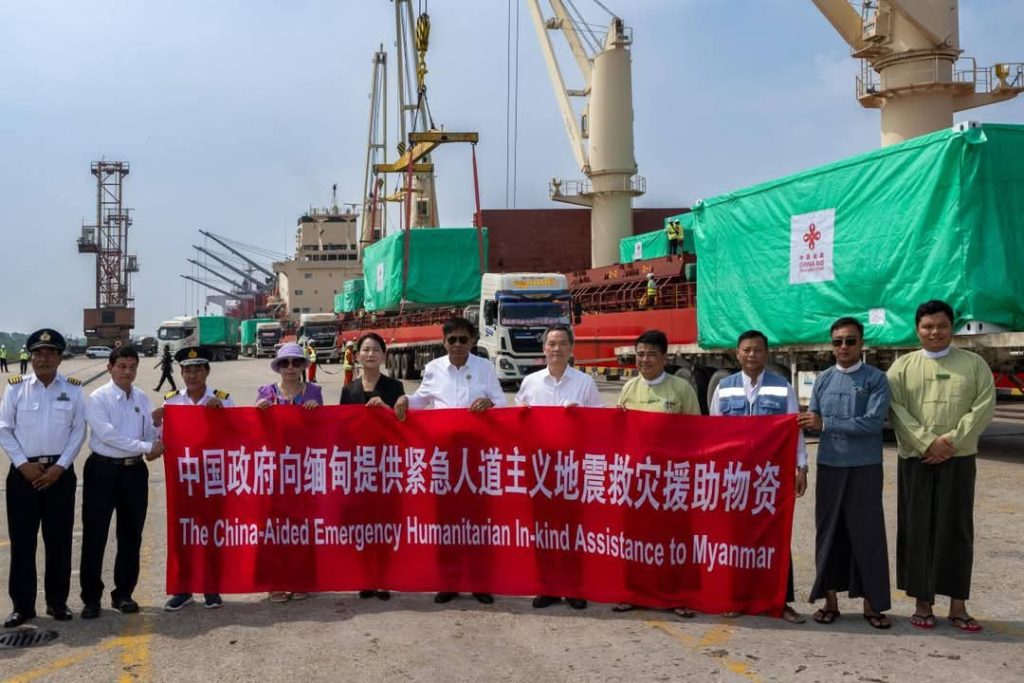တရုတ်နိုင်ငံက မြန်မာ့ငလျင်ဘေးအတွက် ယွမ်သန်း ၁၀၀ ဖိုး ထောက်ပံ့ကူညီရန် ကနဦး ဆုံးဖြတ်ထားပြီး ပထမအသုတ်အလှူအဖြစ် မတ်လ ၃၁ ရက်တွင် ရွက်ဖျင်တဲ ၁,၂၀၀ လုံး၊ ခြုံစောင် ၈,၀၀၀၊ အရေးပေါ်ကယ်ဆယ်ရေးအိတ် ၄ သောင်းကျော်ကူညီထားပြီး ဒုတိယအသုတ် ကူညီကယ်ဆယ်ရေးပစ္စည်းများကို ဧပြီ ၃ ရက်တွင် ရွက်ဖျင်တဲ ၈၀၀ လုံး၊ ခြုံစောင် ၂,၀၀၀၊ ဘီစကွတ်သေတ္တာ ၃၀၀၀၊ Mineral Water သေတ္တာ ၂,၀၀၀ ၊ ဧပြီလ ၅ ရက် တတိယအသုတ်ပစ္စည်းများတွင် ရေသန့်စက် ၁၀၄၈ စုံ၊ ခြင်ထောင်အလုံးရေ ၁၀၀၀၀ ၊ အရေးပေါ်ဆေးအိတ် ၁၅၀၀၀ နှင့် ရွက်ဖျင်တဲအကြီးစား ၄၀၀ စသည်တို့ပါဝင်ပြီး စတုတ္ထအသုတ်ကို ဧပြီ ၉ ရက်တွင် ရွက်ဖျင်တဲ ၁၂၄၈လုံး၊ ခြင်ထောင် ၁၀,၀၀၀ လုံး၊ တာပေါ်လင် ၉,၀၀၀ လိပ်၊ အိပ်ယာအိတ် ၄၀၀၀ ခုနှင့် ထိုနေ့တွင်ပင် ပဉ္စမအသုတ် အကူအညီပစ္စည်းများရောက်ရှိကာ ပါဝင်လာသည်များမှာ ရွက်ဖျင်တဲ ၂၆၆ လုံး၊ ခြင်ထောင် ၂၀,၀၀၀ လုံး၊ တာပေါ်လင် ၉,၀၀၀ လိပ်၊ ခေါက်ဆွဲခြောက် ၂,၀၀၀ သေတ္တာပါဝင်ပြီး စုစုပေါင်းအလေးချိန် ၉၁ တန်ကျော်ရှိကြောင်း သိရသည်။