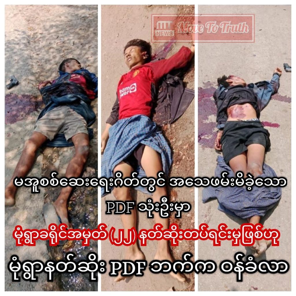 PDF တွေရဲ့ မကြာခဏ လာရောက်တိုက်ခိုက်မှုခံနေရတဲ့ မုံရွာမြို့နယ်၊ မန္တလေး-မုံရွာကားလမ်းပေါ်က မအူစစ်ဆေးရေးဂိတ်မှာ ဆိုင်ကယ်စီးလာတဲ့လူငယ်တွေကို စစ်ဆေးဖို့တားမြစ်ချိန် မောင်းနှင်ထွက်ပြေးတာကြောင့် ပစ်ခတ်ဖမ်းဆီးရာမှာ PDF လူငယ်သုံးဦးရဲ့ ရုပ်အလောင်းနဲ့ ပစ္စတိုနှစ်လက်သိမ်းဆည်းရမိခဲ့တဲ့ဖြစ်စဥ်မှာ သေဆုံးခဲ့တဲ့ PDF သုံးယောက်က NUG ဩဇာခံ မုံရွာခရိုင်အမှတ် (၂၂) နတ်ဆိုးတပ်ရင်းက ဖြစ်တယ်လို့ မုံရွာနတ်ဆိုး PDF အဖွဲ့က ဝန်ခံလာပါတယ်။