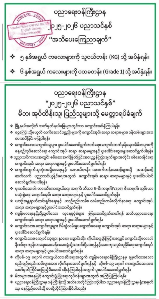 မိဘများအနေဖြင့် ကျောင်းအပ်နှံရာတွင် ၅ နှစ်အရွယ် ကလေးများကို သူငယ်တန်း (KG) သို့ အပ်နှံရန်နှင့် ၆ နှစ်အရွယ် ကလေးများကို ပထမတန်း (Grade 1) သို့ အပ်နှံရန်အသိပေးထားပြီး မြို့နယ်အလိုက် သတ်မှတ်နယ်မြေများတွင်သာ ကျောင်းအပ်နှံရမည်ဖြစ်သည်။